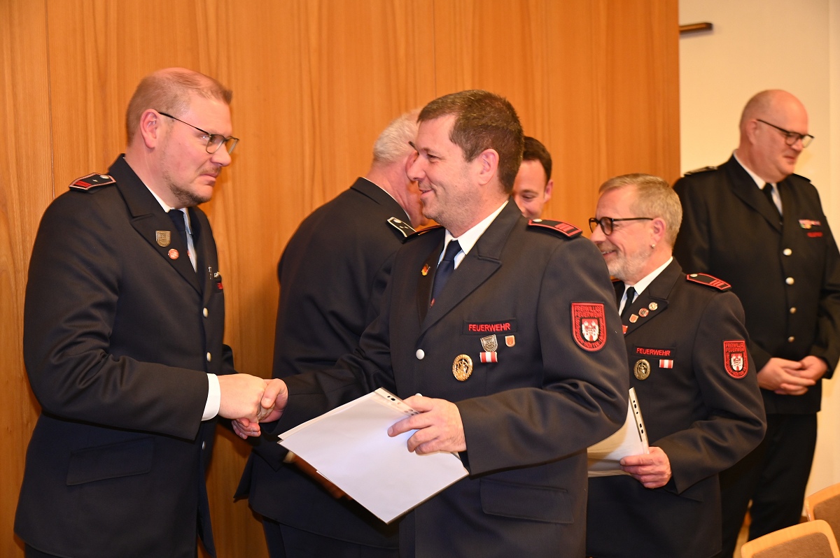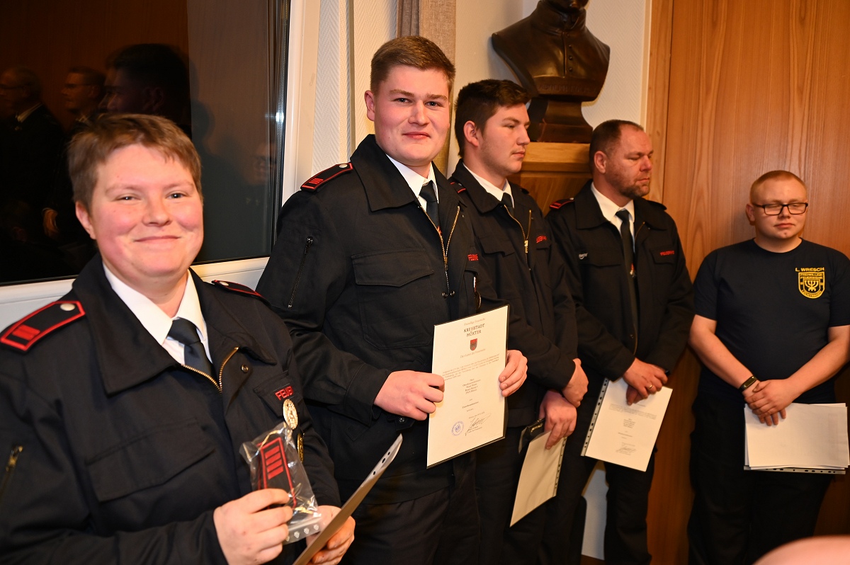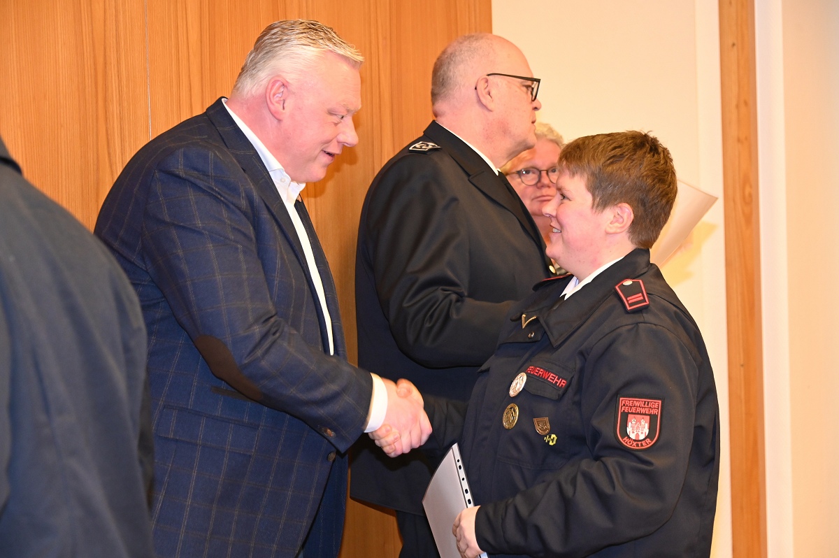 Auch Beförderungen standen auf der Tagesordnung. Zu Unterbrandmeistern wurden Anna Lena Becher, Benjamin Leiße und Noah Hesse befördert. Zum Oberfeuerwehrmann wurden Frederik Hamelmann und Carsten Olandt ernannt. Ingo Wittkowski und Leon Wresche erhielten die Ernennung zum Feuerwehrmann. Für die 30. erfolgreiche Teilnahme an Leistungswettkämpfen wurde Wolfgang Oppermann mit dem Leistungsabzeichen in Gold mit der Zahl 30 ausgezeichnet. Das silberne Leistungsabzeichen erhielt Anna Lena Becher.