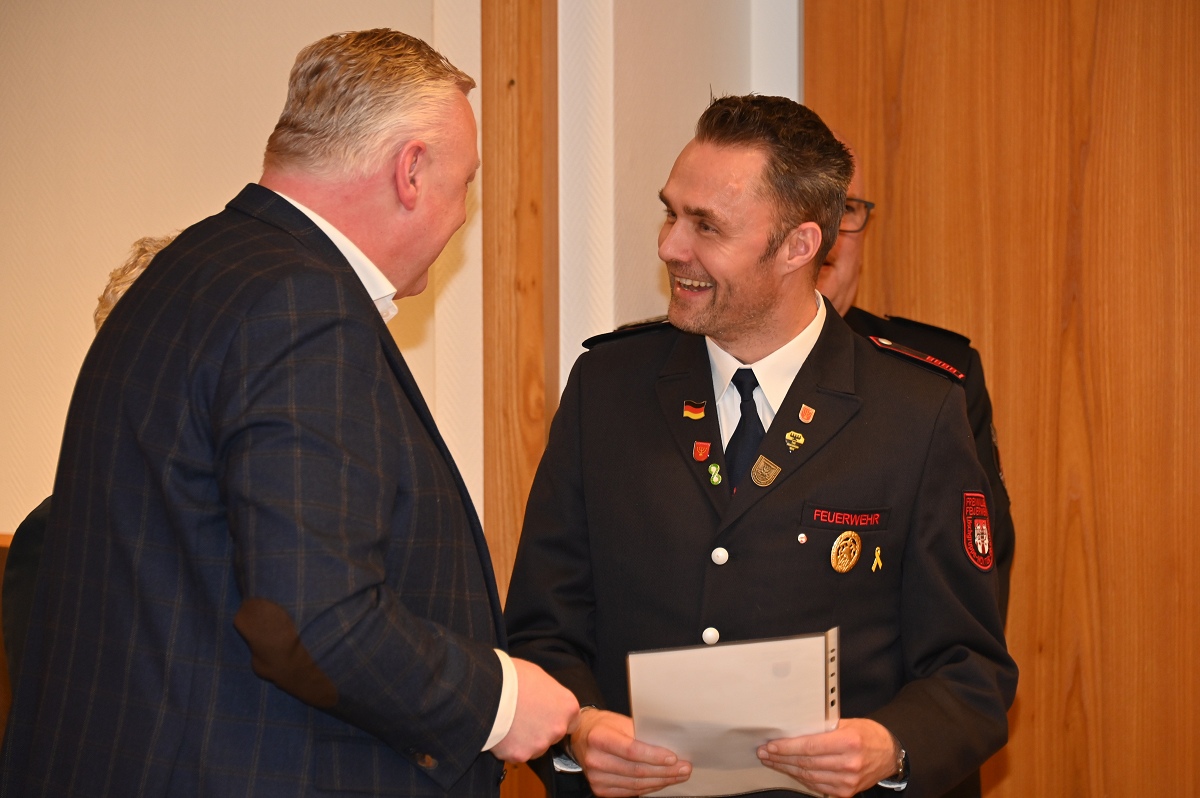 Im Anschluss folgten zahlreiche Ehrungen. Das Feuerwehrehrenzeichen des Landes Nordrhein-Westfalen in Gold verlieh Bürgermeister Daniel Hartmann an Hauptfeuerwehrmann Rolf Hillebrecht, Hauptbrandmeister Andreas Klie, Hauptfeuerwehrmann Jens Lippelt sowie Unterbrandmeister Oliver Heine. Das Ehrenzeichen in Silber für 25 Jahre aktiven Feuerwehrdienst erhielt Unterbrandmeister Sebastian Heine.