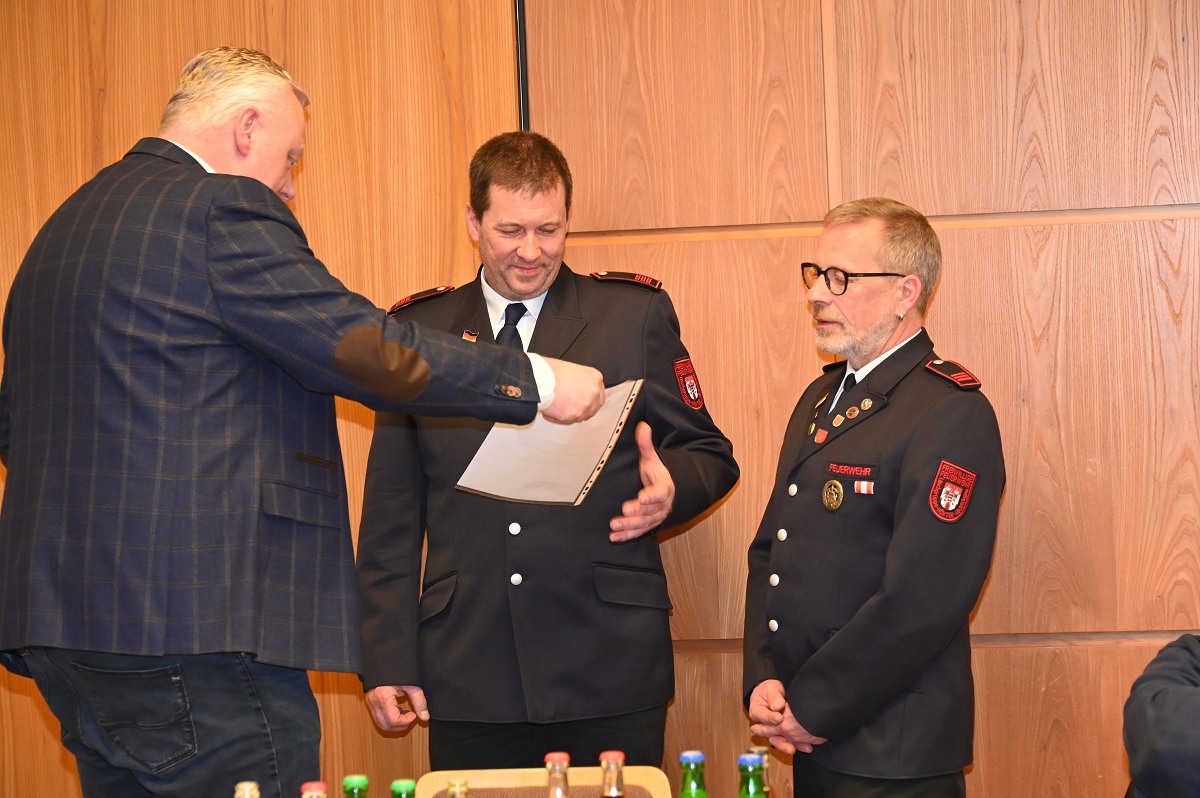 Für zehn Jahre aktiven Dienst wurden Unterbrandmeister Timo Heine und Fabian Rosner in Abwesenheit sowie Hauptfeuerwehrmann Julian Jöhren und Unterbrandmeister Maximilien Meise ausgezeichnet. Urkunden für 20 Jahre aktive Mitgliedschaft erhielten Rudolf Lützer, Patrick Haller und Lukas Heine.