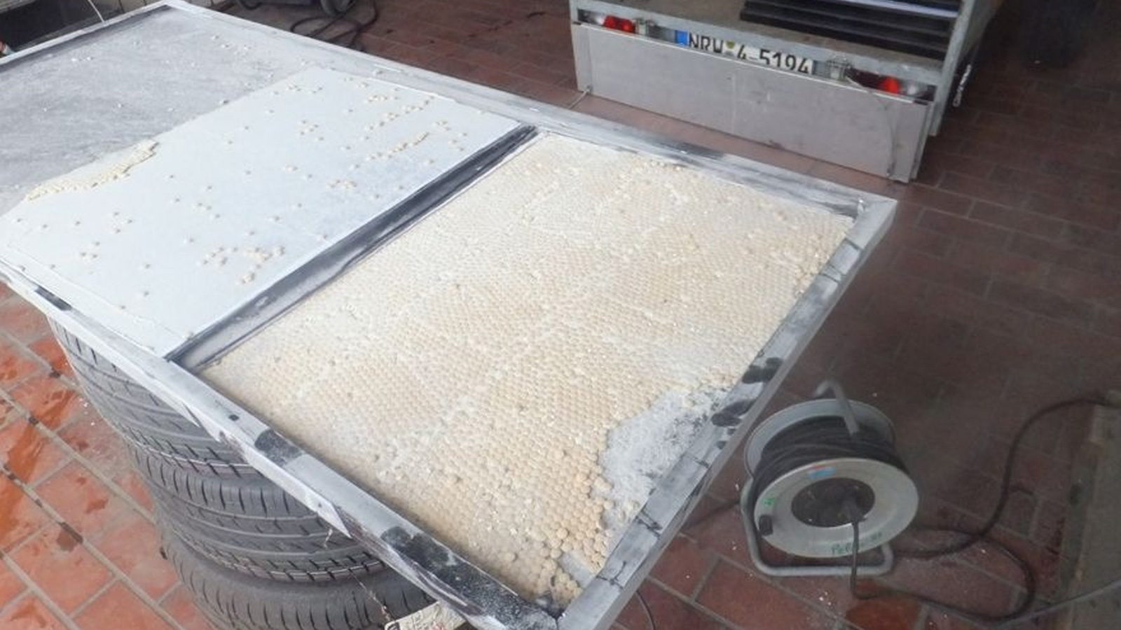 Bei der intensiven Durchsuchung der Räume wurde Diensthund „Lemmy“ schließlich fündig. Er schlug an einem Stapel großer Kartons an, in denen Solarpaneele gelagert waren. Erst bei genauerer Überprüfung wurde das Versteck sichtbar: Auf der Rückseite der Solarpaneele hatte der 27-jährige Lebensgefährte der Kindesmutter eine Schicht Epoxidharz aufgetragen, in die die illegalen Aufputschpillen eingegossen worden waren.