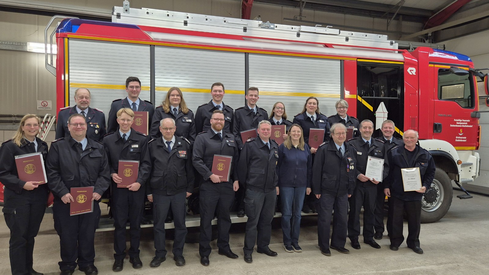 Auch zahlreiche Ehrungen standen auf der Tagesordnung: Jasmin Schwannecke wurde für 25 Jahre Dienst mit der Feuerwehr-Ehrenmedaille ausgezeichnet. Friedhelm Hartmann erhielt eine Ehrung für 40-jährige Mitgliedschaft sowie das Ehrenkreuz des Deutschen Feuerwehrverbandes in Bronze. Eine besondere Auszeichnung wurde Kurt Peters zuteil, dem für seine langjährige Treue seit 1969 die Ehrenmitgliedschaft angetragen wurde.