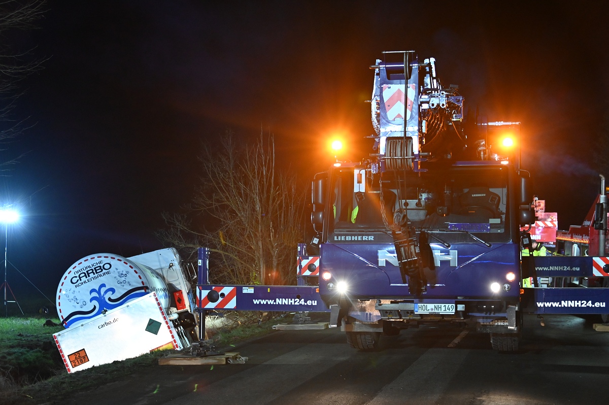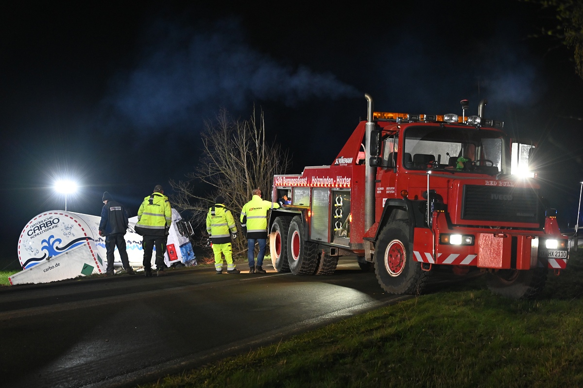 Zum Einsatz kamen unter anderem ein 50-Tonnen-Kran, ein 60-Tonnen-Kran sowie weitere Bergemaschinen aus den Kreisen Höxter und Holzminden. Aufgrund der schwierigen Lage des Lastwagens im Graben zogen sich die Arbeiten über mehrere Stunden hin. Erst gegen 2.30 Uhr gelang es, den Tanklastzug wieder auf die Fahrbahn zu heben und für den Abtransport vorzubereiten.