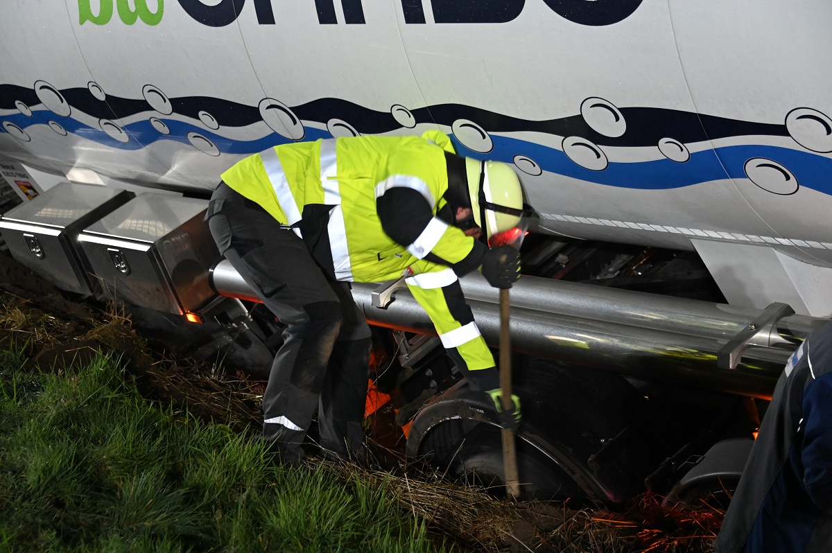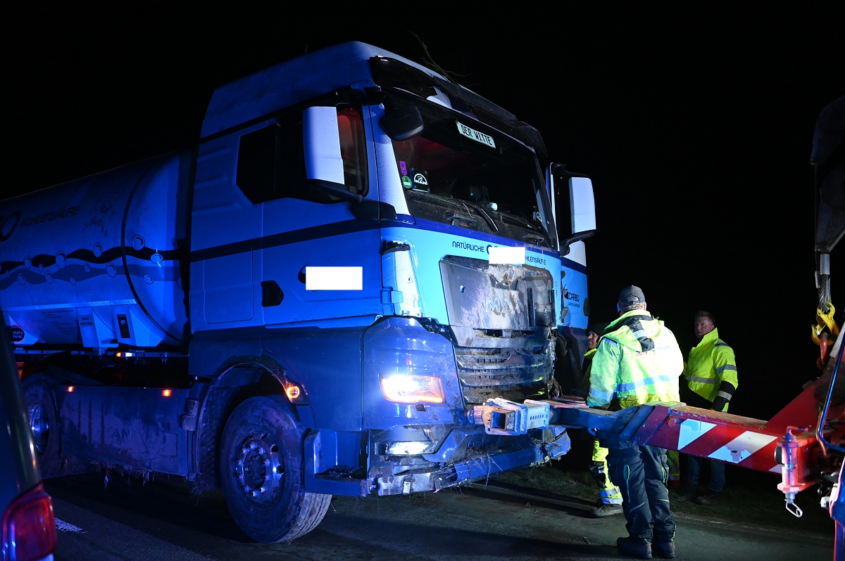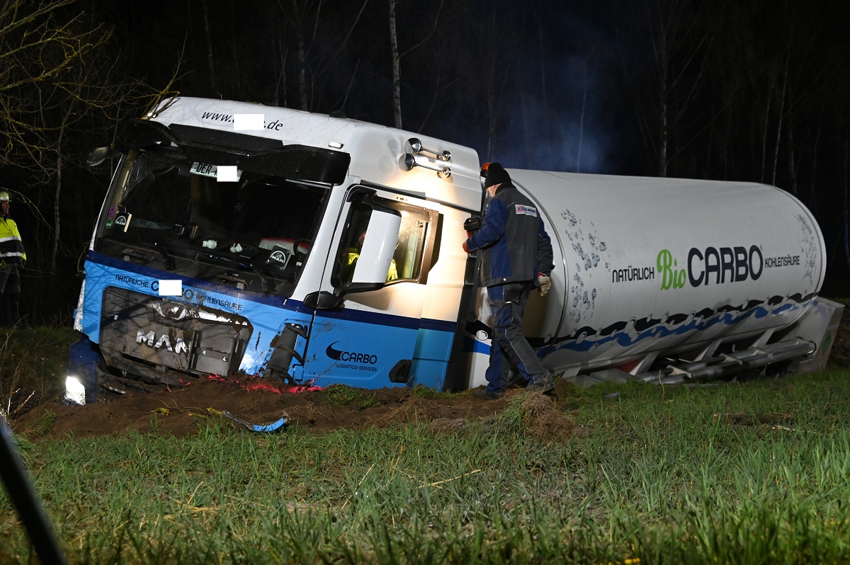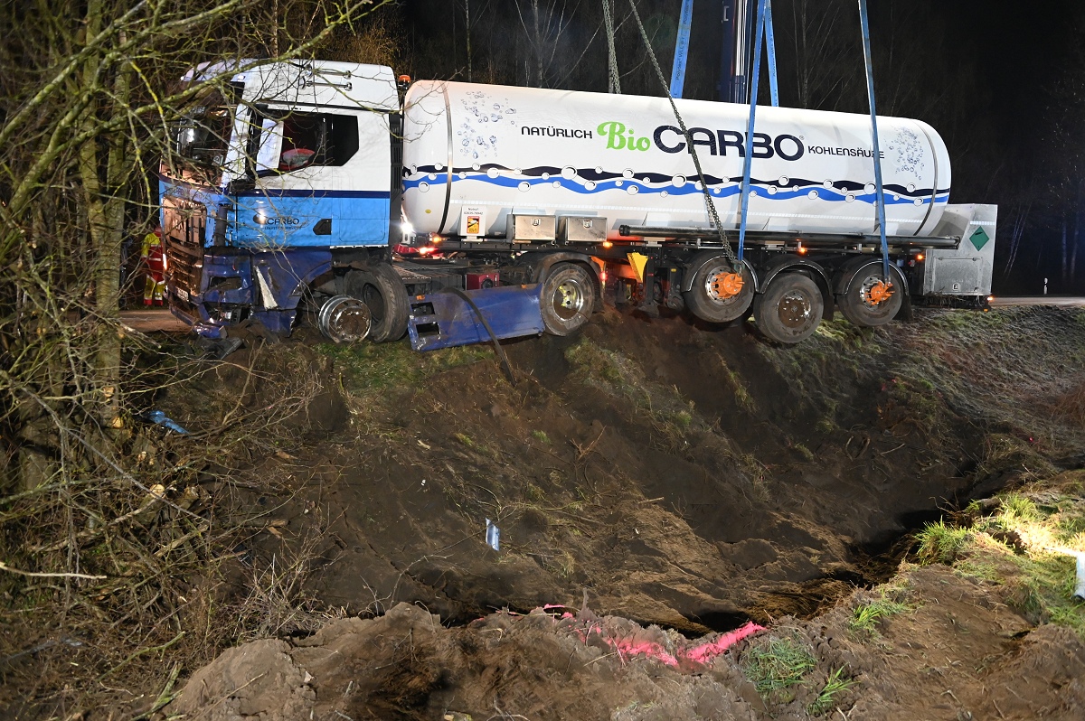 Durch die Wucht des Aufpralls geriet der Pkw in den Straßengraben. Auch der Tanklastzug kam von der Fahrbahn ab und bohrte sich tief in den Graben sowie in den Erdwall eines angrenzenden Ackers. Die Feuerwehr sicherte die Unfallstelle und überprüfte den Tanklastzug auf mögliche Beschädigungen.