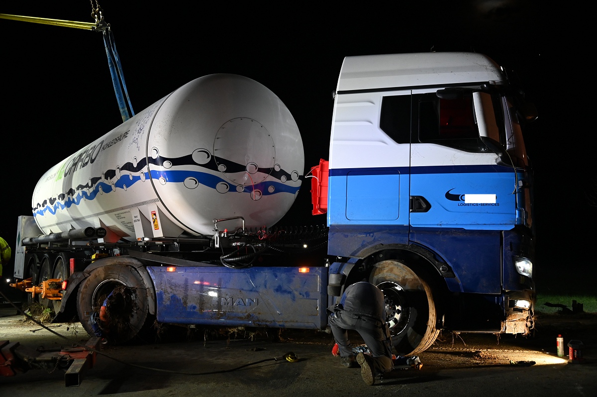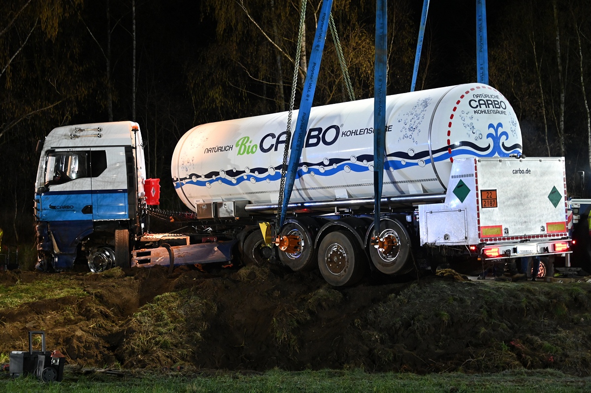 Die Bergung des Tanklastzugs gestaltete sich schwierig und zeitaufwendig. Gegen 21.30 Uhr begannen die Arbeiten, nachdem zunächst ein Baum gekürzt werden musste, um Platz für die schweren Geräte zu schaffen. Die Einsatzstelle wurde großflächig ausgeleuchtet.
