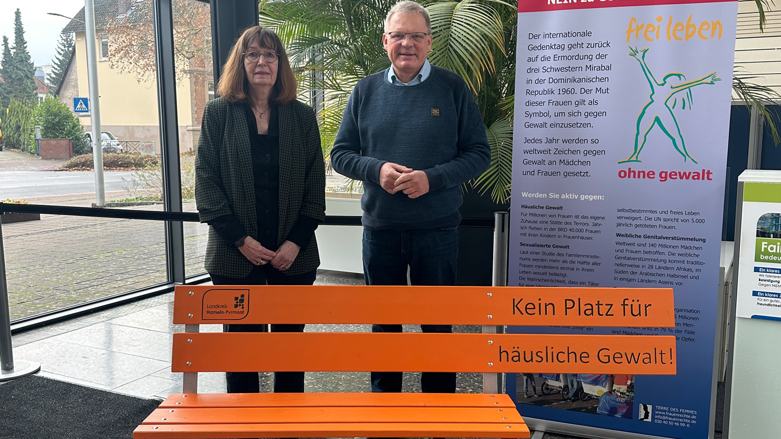 Hameln (red). Anlässlich des Internationalen Tages zur Beseitigung der Gewalt gegen Frauen setzt der Landkreis Hameln-Pyrmont ein sichtbares Zeichen. Im Foyer des Kreishauses wurde eine orangefarbene Bank aufgestellt, die dauerhaft an die Bedeutung eines sicheren Lebensumfelds für Frauen erinnern soll.