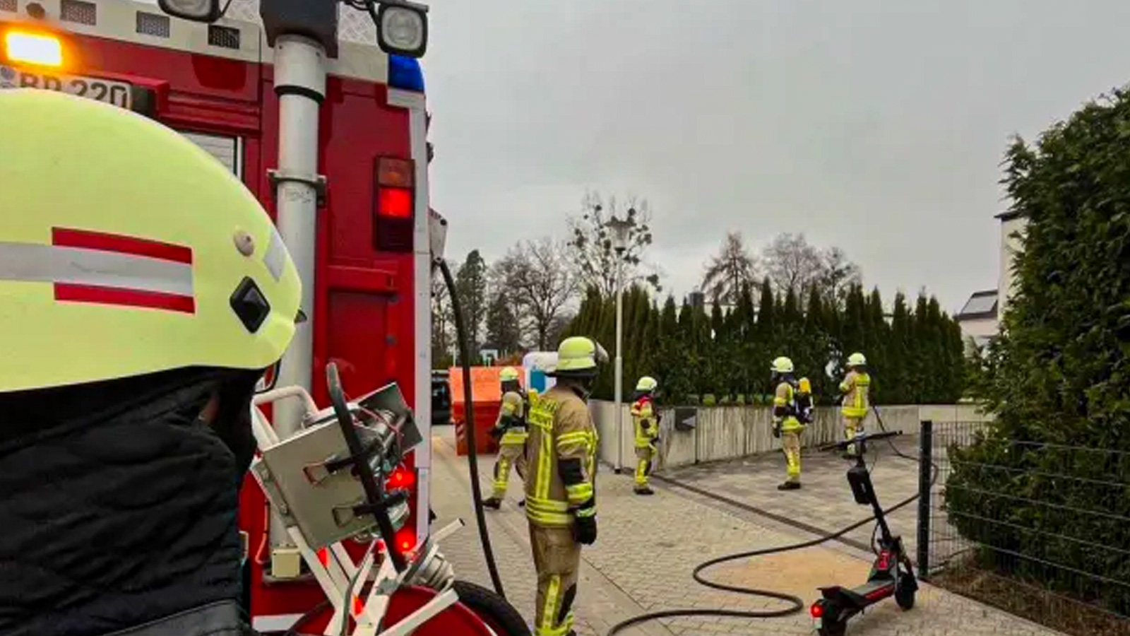 Noch vor dem Eintreffen der Feuerwehr griffen Anwohnerinnen und Anwohner gemeinsam mit dem zuerst eingetroffenen Rettungsdienst ein. Mit einem Wasserschlauch gelang es ihnen, die Flammen einzudämmen und ein Übergreifen auf das Wohnhaus zu verhindern.