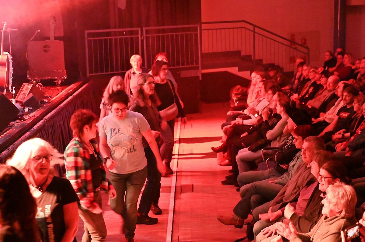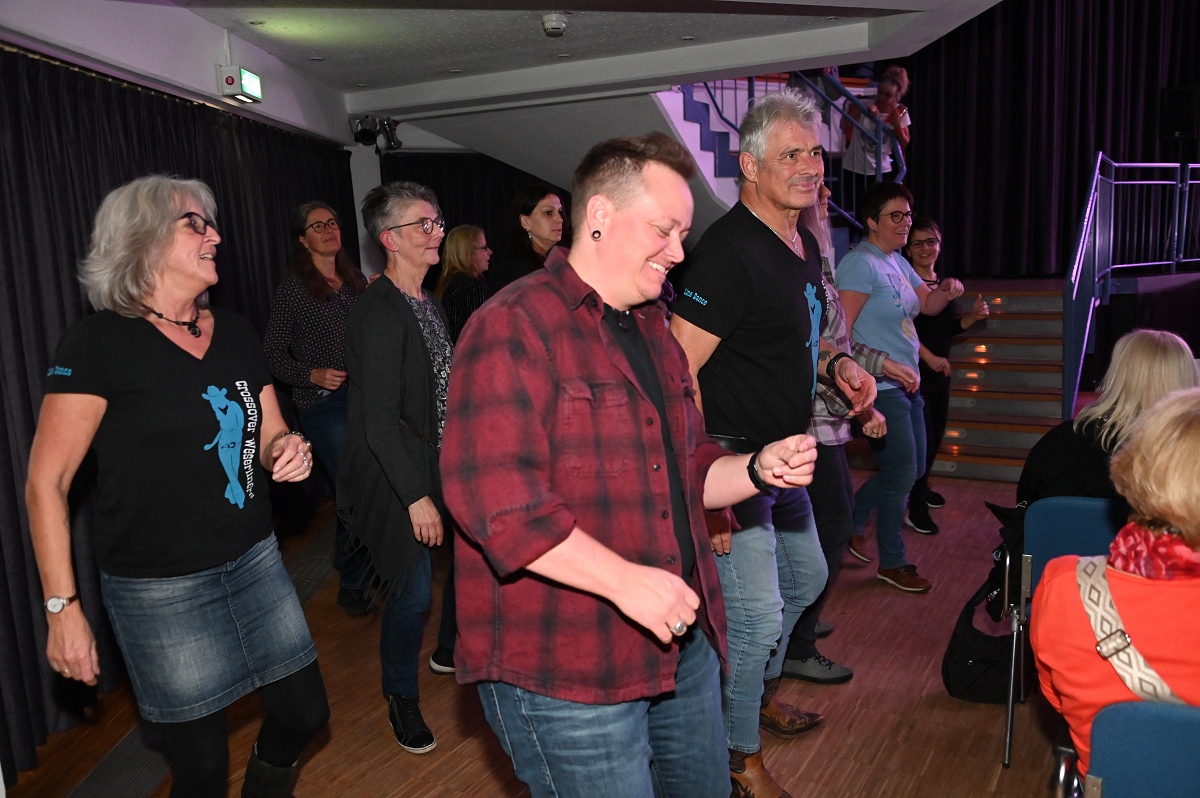 Die Linedancer erwiesen sich als wahrer Stimmungsmotor in der Halle. Unter ihnen war auch die Höxteranerin Tamara Weber, Mitglied der Line-Dance-Gruppe „Crossover Weserliners“ des MTV Holzminden e.V. Sie ließ sich von der Musik mitreißen und tanzte am Rand der Bühne eine spontane Choreografie zu den bekannten Songs. Aktuell tanzen die „Crossover Weserliners“ in Holzminden regelmäßig mit etwa 10 bis 14 Personen. Der Name sei entstanden, weil die Gruppe ursprünglich in Höxter – in der ehemaligen Fahrschule Weber – begann und später „über die Weser wechselte“ zum MTV Holzminden, erklärte Weber. „An diesem Abend hätten wir zu allen Liedern tanzen können“, sagte sie. Der Bühnenrand wurde so kurzerhand zur zweiten Bühne, von der aus sich die Dynamik wie eine Welle durch die gesamte Stadthalle ausbreitete.