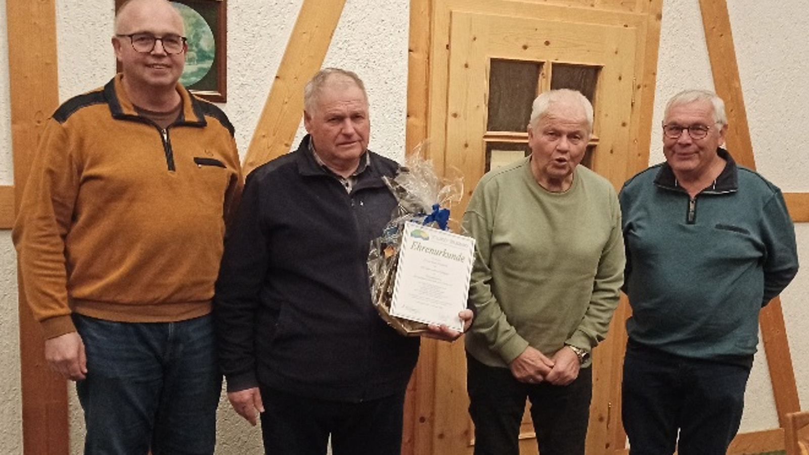 SB-Geschäftsführer Ralf Bähre, Jubilare Kurt Diedrich und Manfred Grebe, zweiter Vorsitzender von Germania Derental, Günter Handtke.