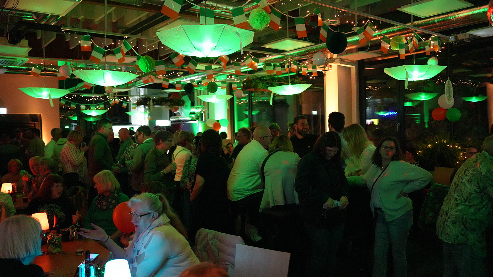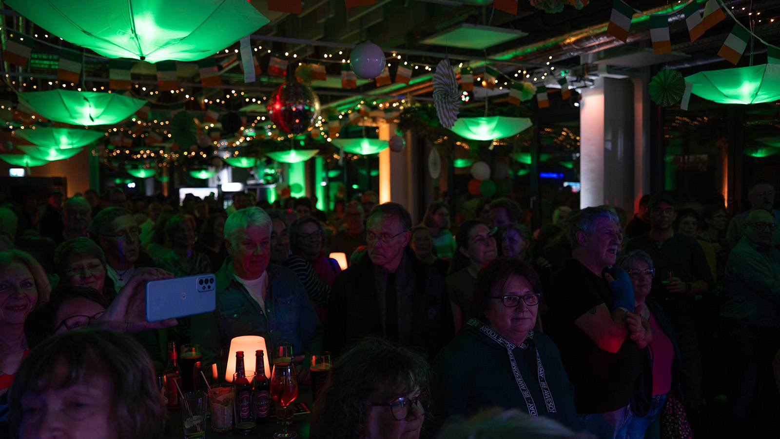 Bereits beim Betreten der Location wurde deutlich, dass der Abend konsequent im Stil der „grünen Insel“ gestaltet war. Passende Dekorationen, gedimmtes Licht und thematische Details sorgten für ein authentisches Ambiente. Viele Gäste griffen das Motto auch in ihrer Kleidung auf: Von Kleeblatt-Brillen bis hin zu auffälligen, grün glitzernden Accessoires prägte ein durchgehend stimmiges Gesamtbild das Geschehen.