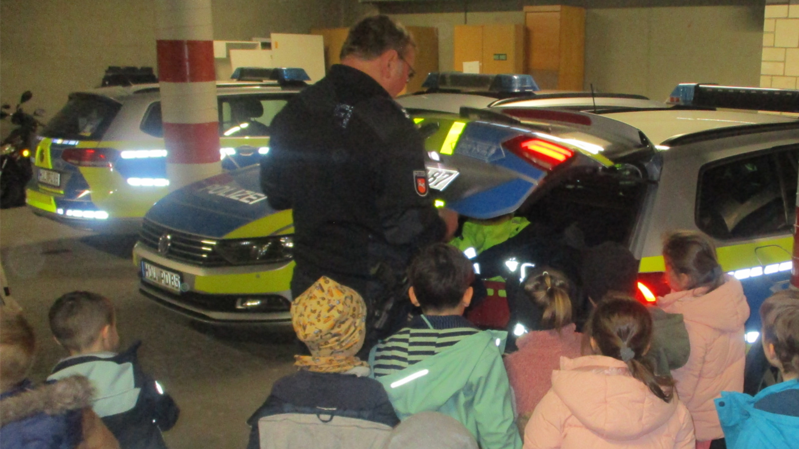 Ein weiterer Programmpunkt war die Besichtigung der Einsatzfahrzeuge in der Tiefgarage. Ob Streifenwagen, Motorrad oder Zivilfahrzeug – die Kinder konnten die Fahrzeuge aus nächster Nähe betrachten und erfuhren mehr über deren Einsatzmöglichkeiten.