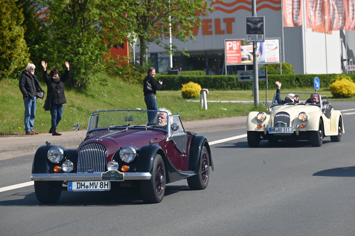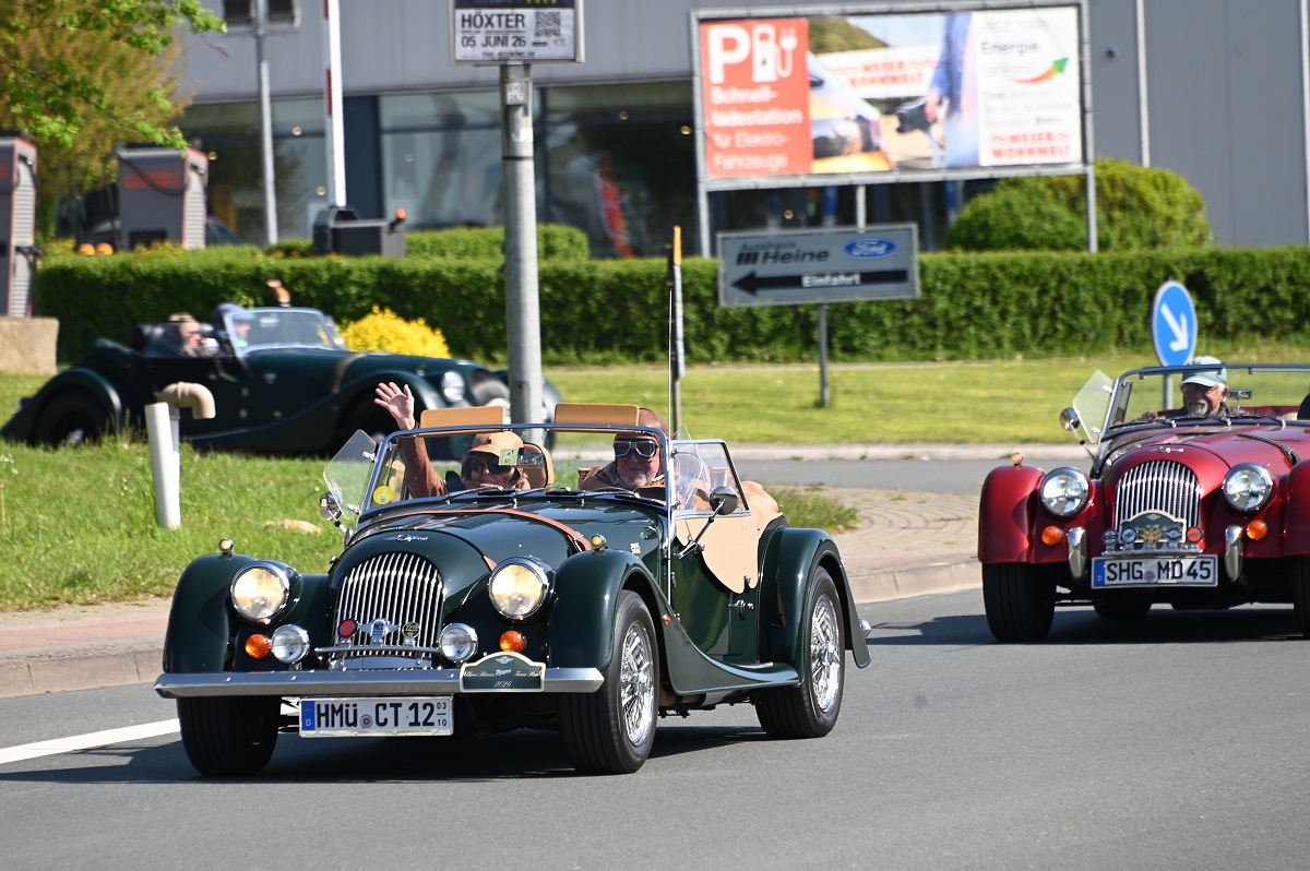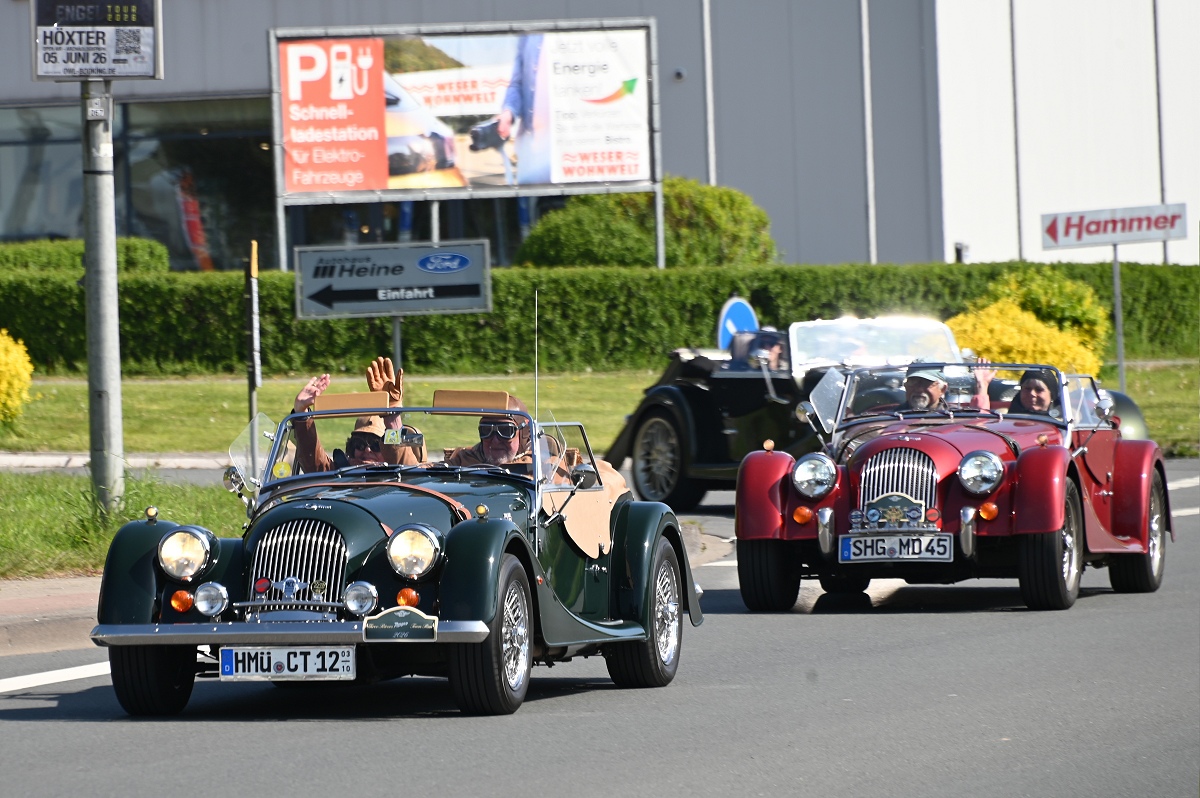 Höxter (TKu). Eine ungewöhnliche Fahrzeugkolonne hat sich am Samstagvormittag bei strahlendem Sonnenschein von Höxter aus durch das Weserbergland in Bewegung gesetzt: 14 handgefertigte Sportwagen der britischen Marke Morgan Motor Company starteten mit ihren Fahrerinnen und Fahrern aus verschiedenen Teilen Norddeutschlands vom Parkplatz eines Burger-Restaurants zur zweitägigen Tour durch die Region.