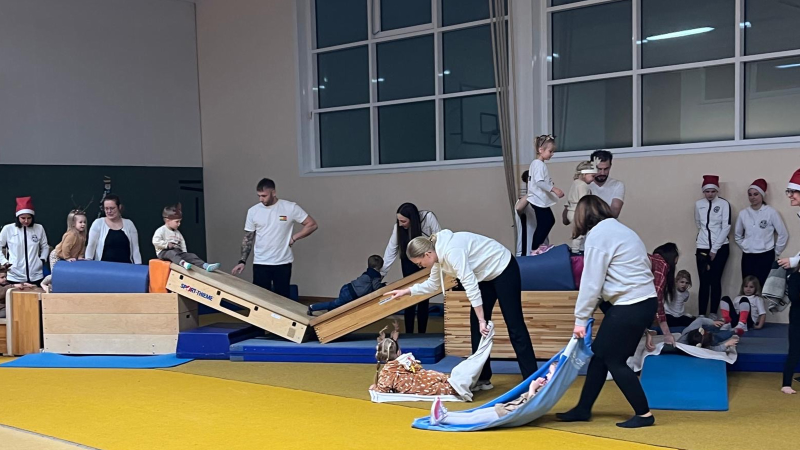 Es folgte die Darbietung des Eltern-Kind-Turnens. Passend zur Jahreszeit als kleine Rentiere verkleidet, zauberten die Kinder gemeinsam mit ihren Begleitpersonen dem Publikum ein Lächeln ins Gesicht. Zunächst wurde ein gemeinsames Spiel gezeigt, anschließend präsentierte die Gruppe eine abwechslungsreiche Turnlandschaft und gab damit einen anschaulichen Einblick in die Inhalte der wöchentlichen Übungsstunden.