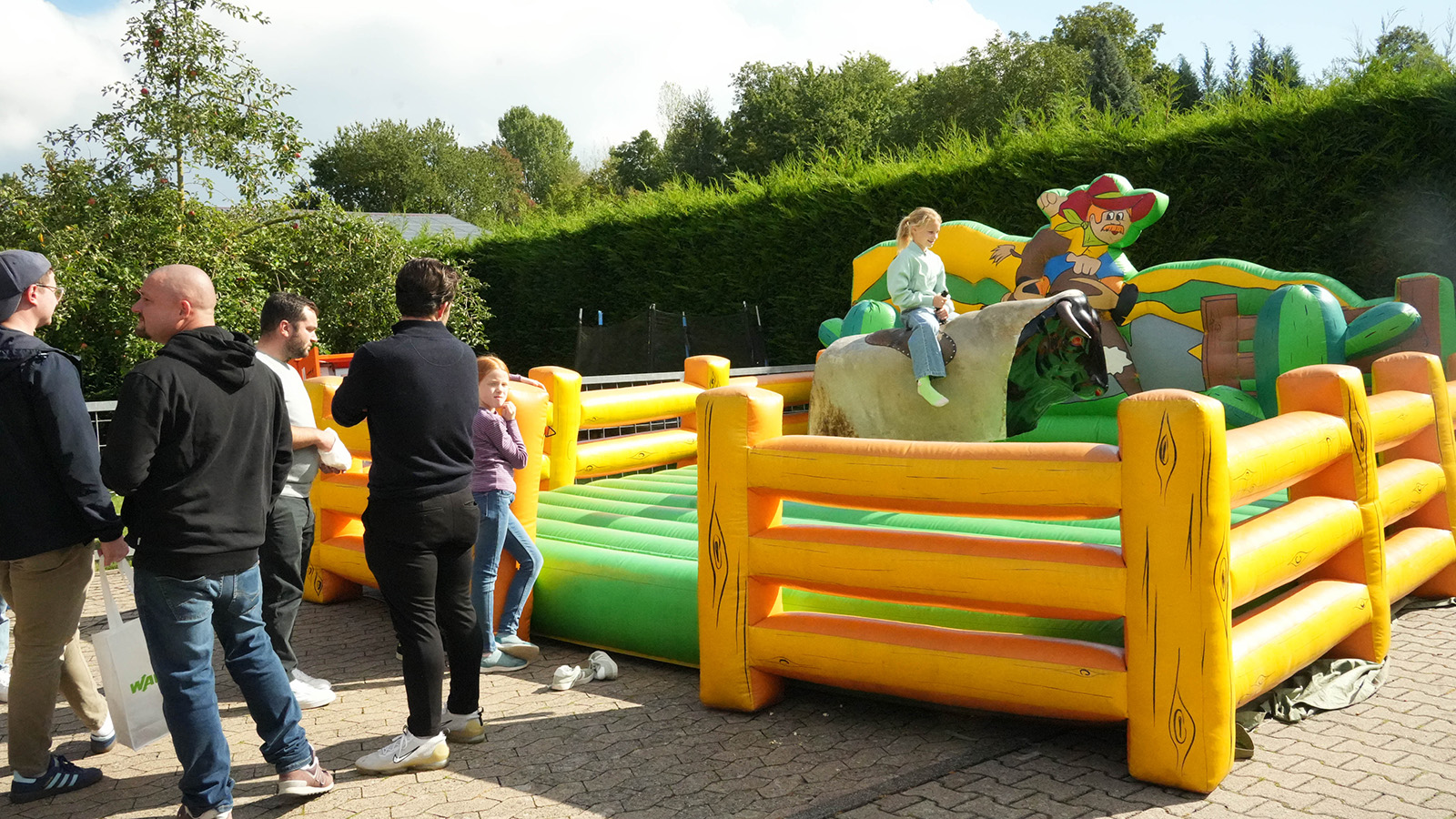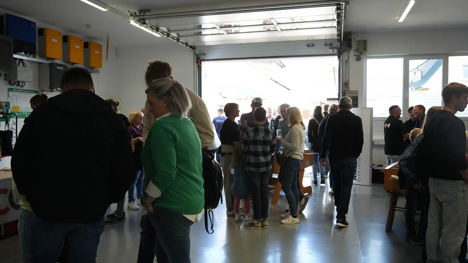 Die kleinen Gäste tobten sich währenddessen auf der Hüpfburg aus oder wagten ein paar Runden auf dem Rodeo, während die Eltern über das Fachliche ins Gespräch kamen. Auf einer kleinen Messeausstellung präsentierten Partnerunternehmen ihre Neuheiten: Werkzeuge von „HILTI“, der eindrucksvolle Produktsprinter von „BTI“ oder die Beratung von „sonepar“ zogen die Aufmerksamkeit der Besucher auf sich. In den Garagen des Unternehmens zeigten namhafte Marken wie „Siemens“, „Wago“, „Busch-Jaeger“, „Hensel“, „Niedax Group“, „Siteco“ und „Knx/Jung“ ihr Portfolio – begleitet von kleinen Extras wie Popcorn, Slushis oder Mitmachaktionen. Wer zwischendurch Lust auf Abwechslung hatte, konnte sich beim Tischkicker spannende Duelle liefern.