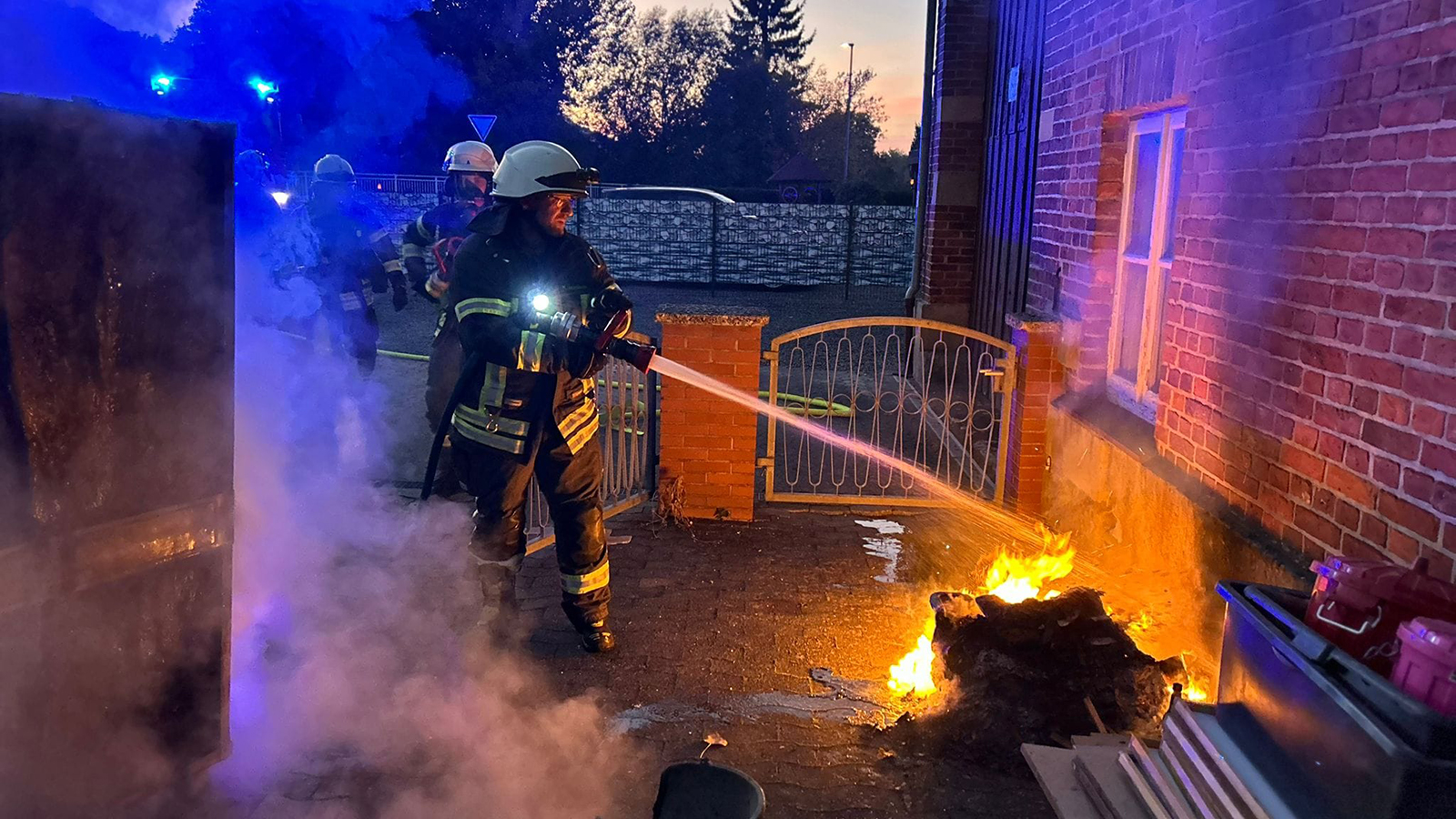 Um 18:48 Uhr folgte der nächste Einsatz in Scharfoldendorf, Tiefe Straße. Dort standen ein Müllcontainer sowie Holz und Unrat neben einer Scheune in Flammen. Die Feuerwehr konnte das Feuer zügig löschen und ein Übergreifen auf das Gebäude verhindern.