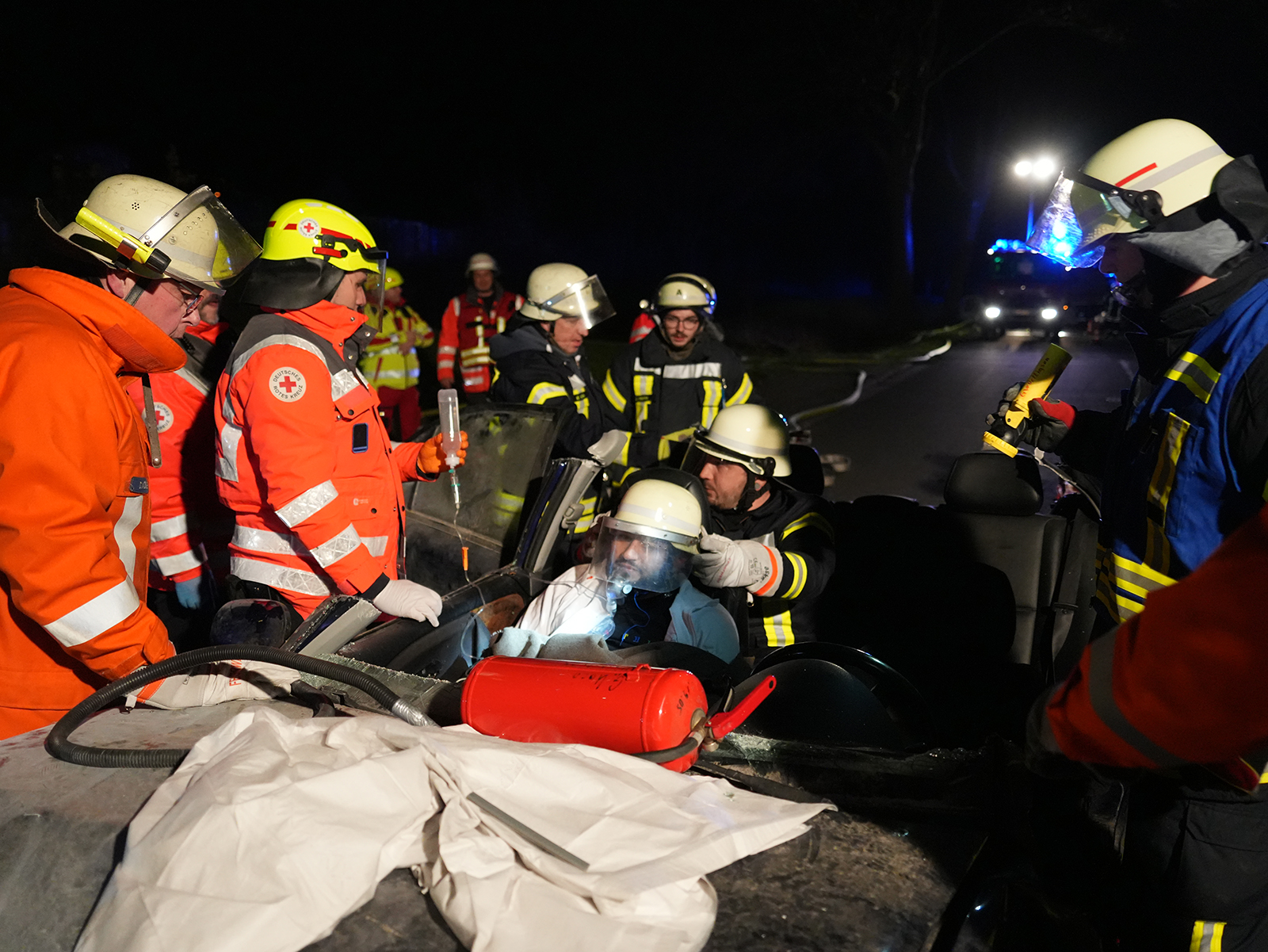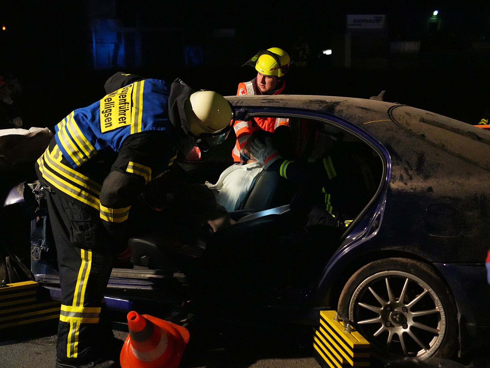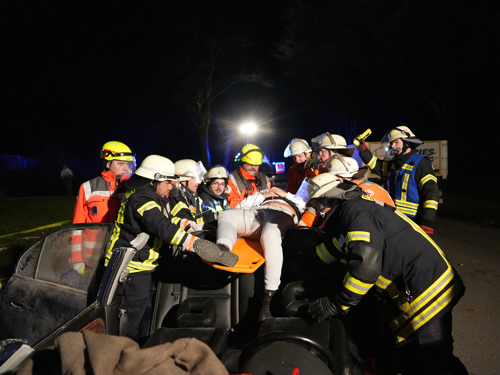 Zunächst wurde der Mitfahrer auf dem Rücksitz befreit und medizinisch versorgt. Da sich die vorderen Türen nicht öffnen ließen, erfolgte die Erstversorgung der Fahrerin und des Beifahrers über die Fenster. Parallel bereiteten die Feuerwehrmitglieder den Einsatz der Spreizschere vor, da ein Öffnen der Türen anders nicht möglich war. Vorsichtig entfernten sie zunächst die Fahrertür und retteten die Fahrerin aus dem Wagen. Ein Feuerwehrmitglied stabilisierte auf der Rückbank den Kopf des Beifahrers, der eine schwere Kopfverletzung simulierte. Anschließend wurde unter Einsatzleiter Oliver Jeschke das Dach des Fahrzeugs abgenommen, sodass auch der Beifahrer befreit werden konnte.