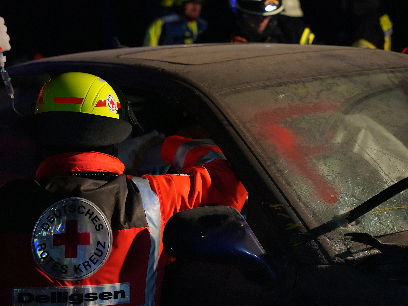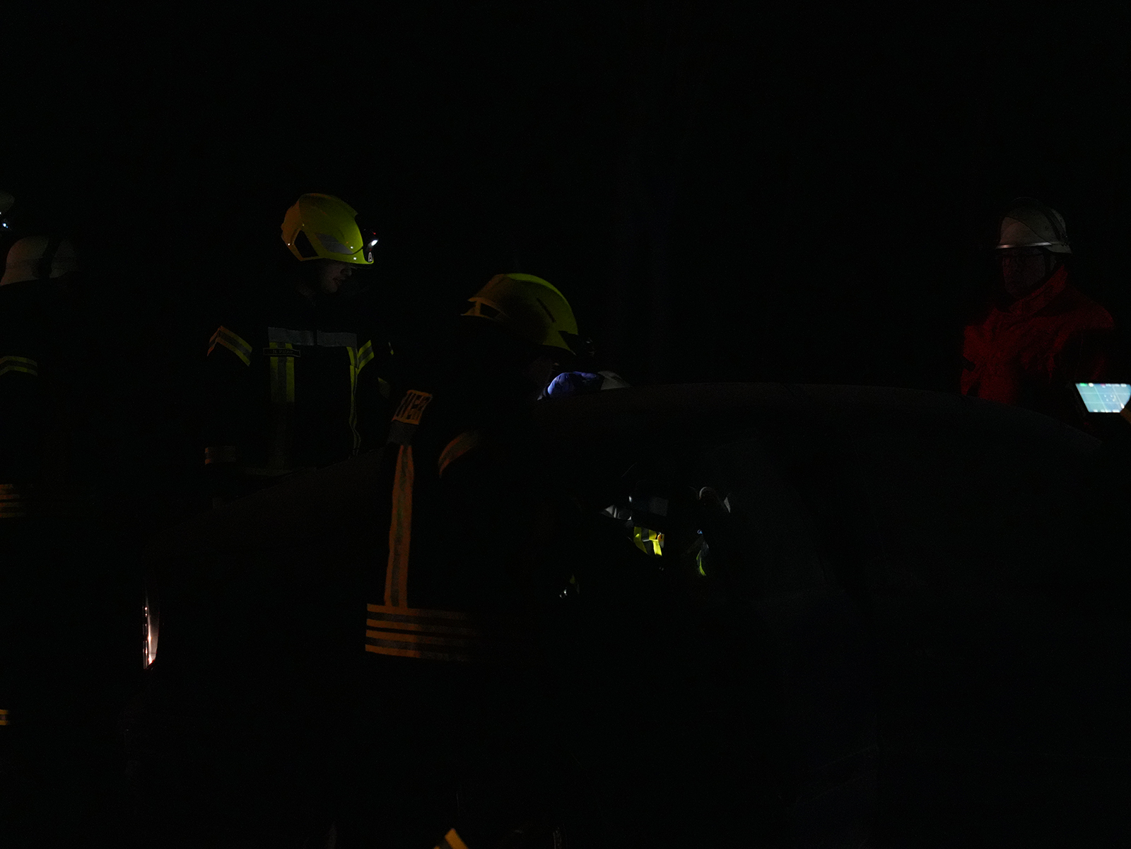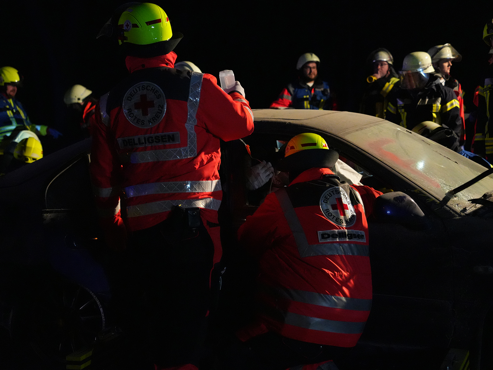 Zunächst wurde der Mitfahrer auf dem Rücksitz befreit und medizinisch versorgt. Da sich die vorderen Türen nicht öffnen ließen, erfolgte die Erstversorgung der Fahrerin und des Beifahrers über die Fenster. Parallel bereiteten die Feuerwehrmitglieder den Einsatz der Spreizschere vor, da ein Öffnen der Türen anders nicht möglich war. Vorsichtig entfernten sie zunächst die Fahrertür und retteten die Fahrerin aus dem Wagen. Ein Feuerwehrmitglied stabilisierte auf der Rückbank den Kopf des Beifahrers, der eine schwere Kopfverletzung simulierte. Anschließend wurde unter Einsatzleiter Oliver Jeschke das Dach des Fahrzeugs abgenommen, sodass auch der Beifahrer befreit werden konnte.
