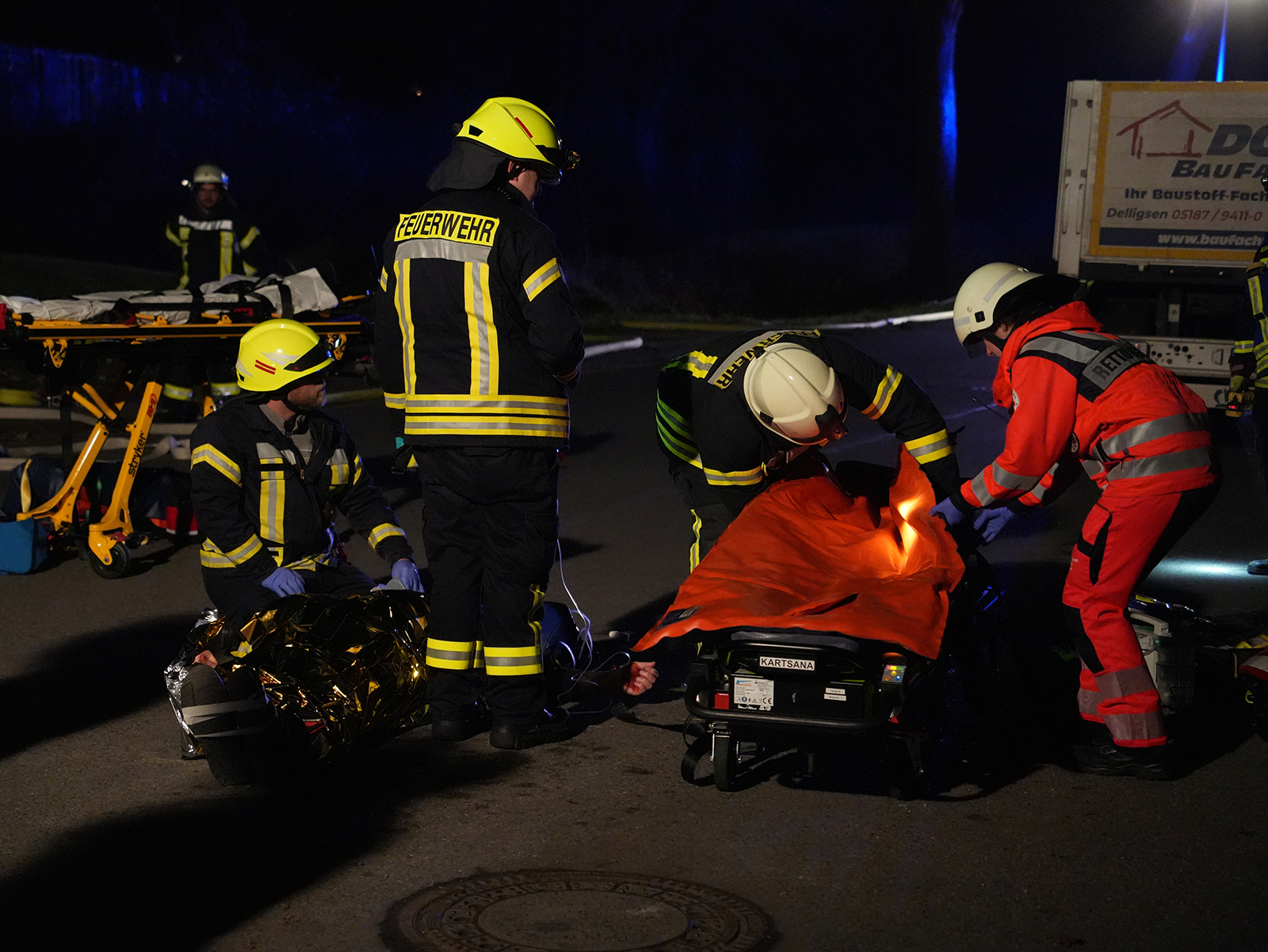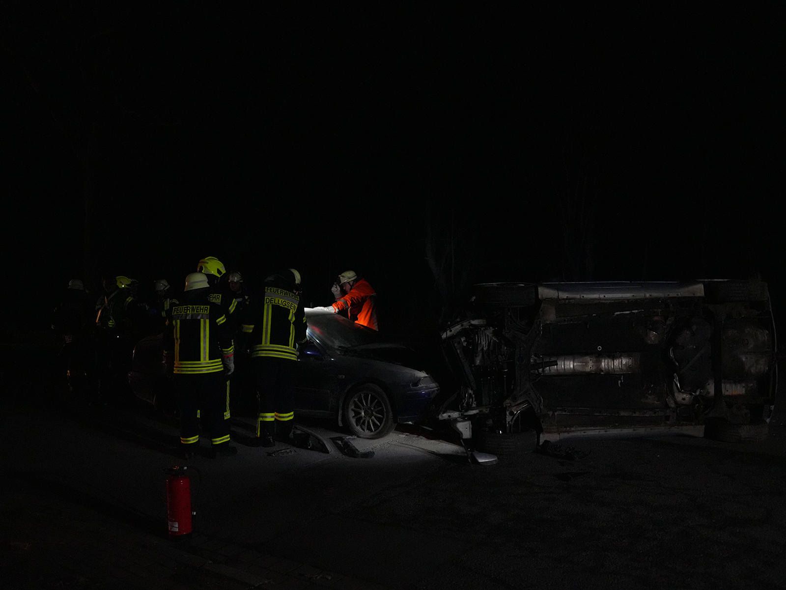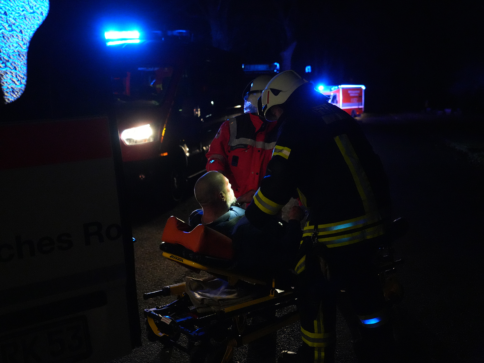 Während die Rettung der drei Verletzten lief, machte sich ein Trupp der Feuerwehr auf die Suche nach dem Fahrer des zweiten Fahrzeugs. Mithilfe einer Drohne mit Wärmebildkamera wurde das umliegende Gelände abgesucht. So konnte die vermisste Person zügig gefunden und medizinisch versorgt werden.