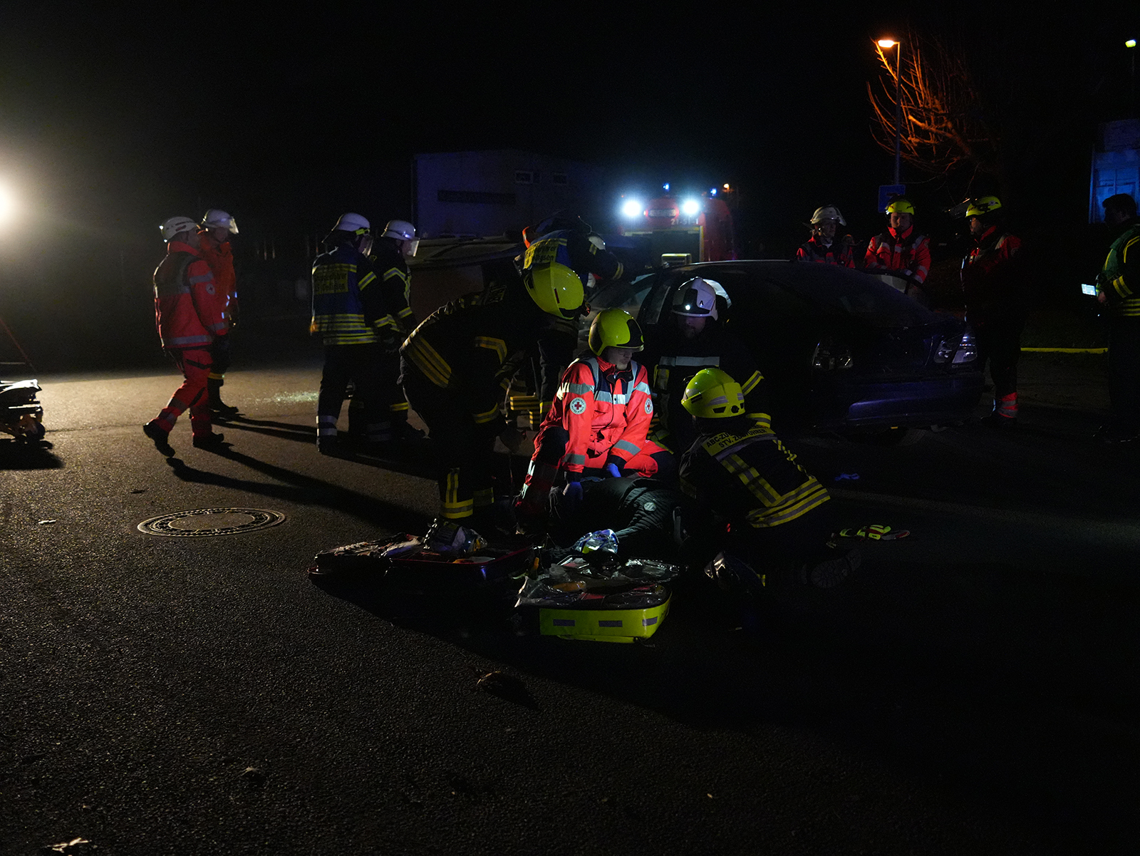 Das angenommene Szenario sah einen Frontalzusammenstoß zweier Fahrzeuge vor, von denen eines auf die Seite gekippt war. Vom Fahrer des umgestürzten Wagens fehlte zunächst jede Spur, während sich im zweiten Fahrzeug drei schwer verletzte Personen befanden. Die Einsatzkräfte stellten schnell fest, dass alle Türen bis auf die hintere rechte Tür verschlossen waren, was die Rettung erschwerte.