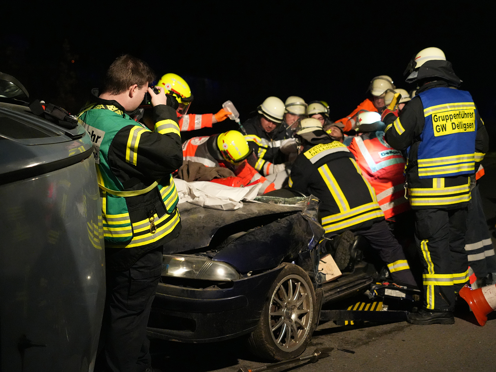 Delligsen (zir). Was auf den ersten Blick wie ein schwerer Verkehrsunfall wirkte, entpuppte sich am Dienstagabend als umfangreiche Übung der Feuerwehr Delligsen. Unter Sondersignal fuhren die Einsatzkräfte gegen 17.56 Uhr zur Straße Am Gewerbering. Sieben Minuten nach der Alarmierung trafen die ersten Kräfte vor Ort ein. Die Übung, geplant von Ortsbrandmeister Dennis Ohlscher und seinem Stellvertreter Jan Knackstedt, stellte die Beteiligten dennoch vor besondere Herausforderungen.