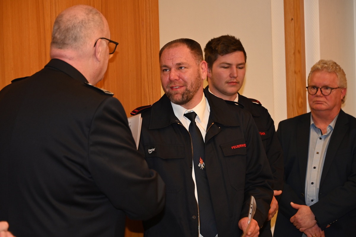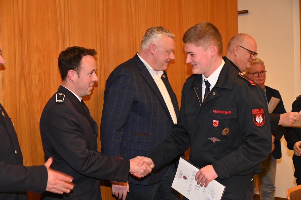 Auch Beförderungen standen auf der Tagesordnung. Zu Unterbrandmeistern wurden Anna Lena Becher, Benjamin Leiße und Noah Hesse befördert. Zum Oberfeuerwehrmann wurden Frederik Hamelmann und Carsten Olandt ernannt. Ingo Wittkowski und Leon Wresche erhielten die Ernennung zum Feuerwehrmann. Für die 30. erfolgreiche Teilnahme an Leistungswettkämpfen wurde Wolfgang Oppermann mit dem Leistungsabzeichen in Gold mit der Zahl 30 ausgezeichnet. Das silberne Leistungsabzeichen erhielt Anna Lena Becher.