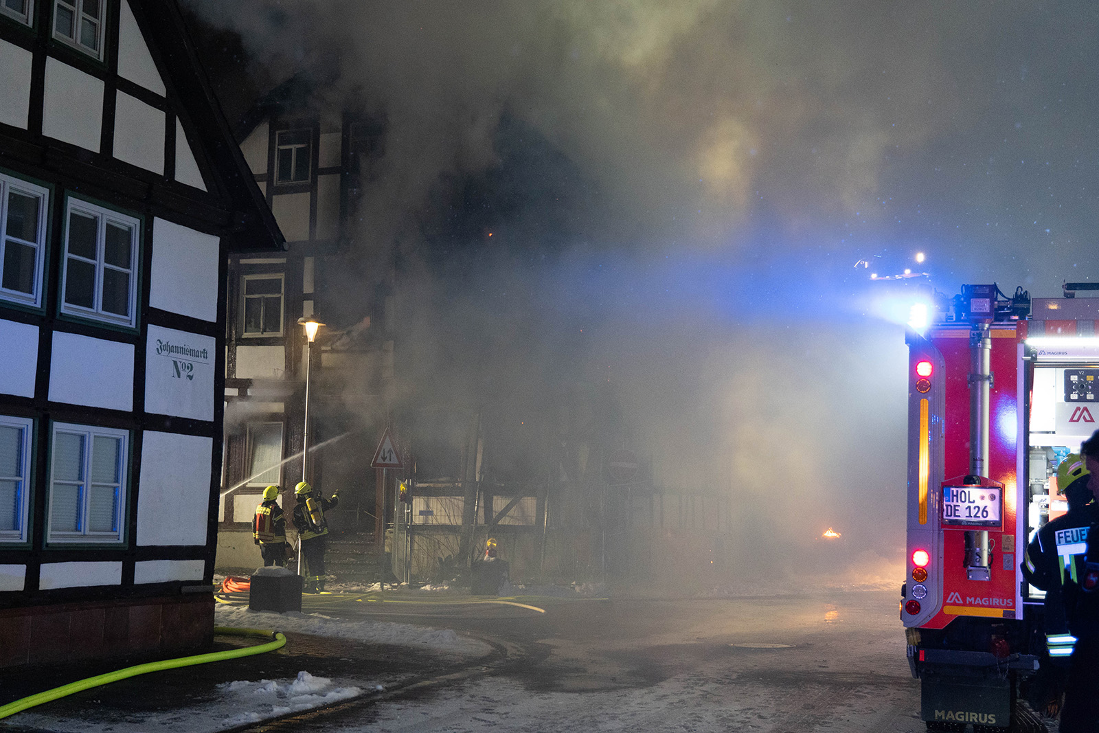Holzminden (zir). Ein gemeldetes Feuer in einer Wohnung in der Johannisstraße hat am frühen Donnerstagmorgen einen Großeinsatz der Feuerwehr ausgelöst. Um 4:43 Uhr wurden die Einsatzkräfte zu einem Brand in einem Gebäude in der Johannisstraße alarmiert. Bereits beim Eintreffen stand das Untergeschoss in Vollbrand, die Flammen hatten zu diesem Zeitpunkt bereits auf das erste Obergeschoss übergegriffen.
