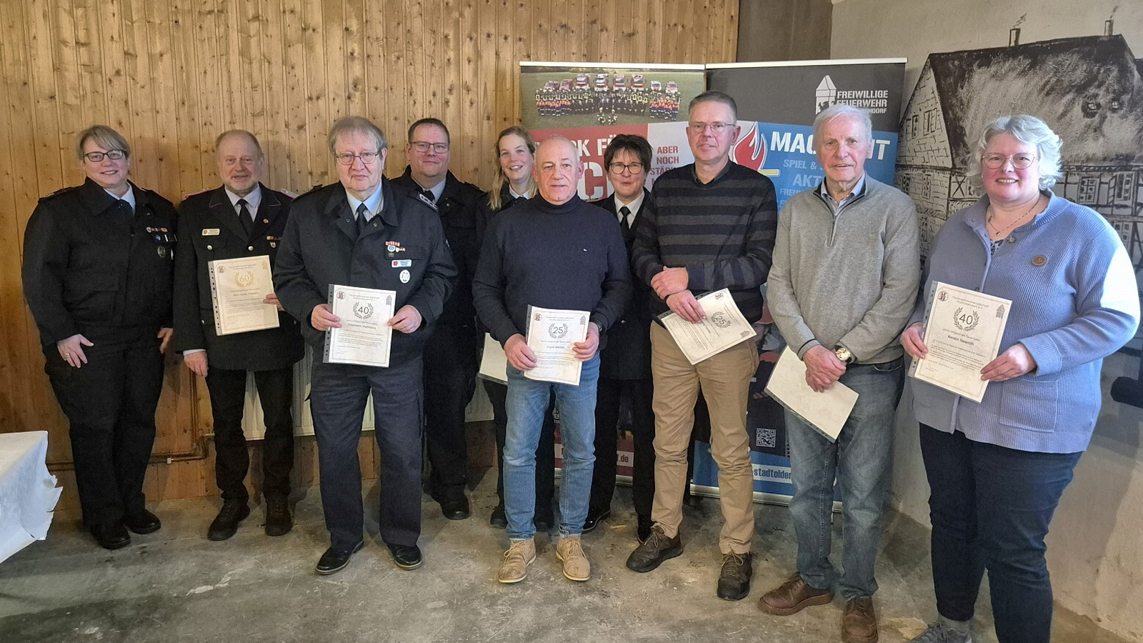 Im weiteren Verlauf der Versammlung gab es zudem wieder zahlreiche Mitglieder, die für ihre teils jahrzehntelange Treue zur Feuerwehrkameradschaft geehrt werden konnten. Für 25 Jahre Mitgliedschaft waren das die Mitglieder Dieter Hämerling, Frank Stenzel, Axel Maschler, Jasmin Schwannecke, Lothar Hacke, Gerhard Minnich, Jörg Henke und Roland Müller sowie für 40 Jahre Mitgliedschaft die Mitglieder Friedhelm Hartmann, Kerstin Nawroth, Edmund Teiwes und Detlef Bantel. Für 50 Jahre Mitgliedschaft in der Feuerwehrkameradschaft wurden Heinz-Gerhard Taake, Klaus Adler und Uwe Jäger geehrt, für 60 Jahre Karl-Heinz Thiessen und Willi Rumpeltin sowie für 65 Jahre das Mitglied Günther Rettig und für 75 Jahre Wilfried Schrader.