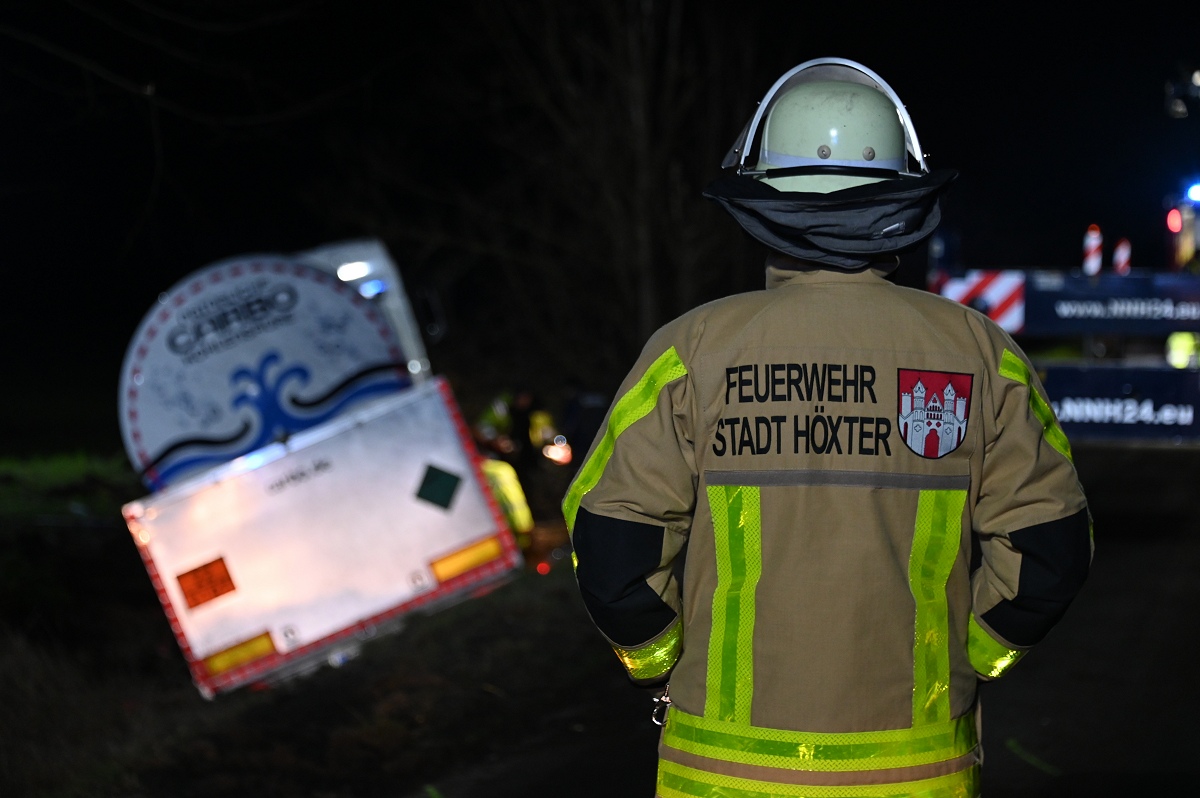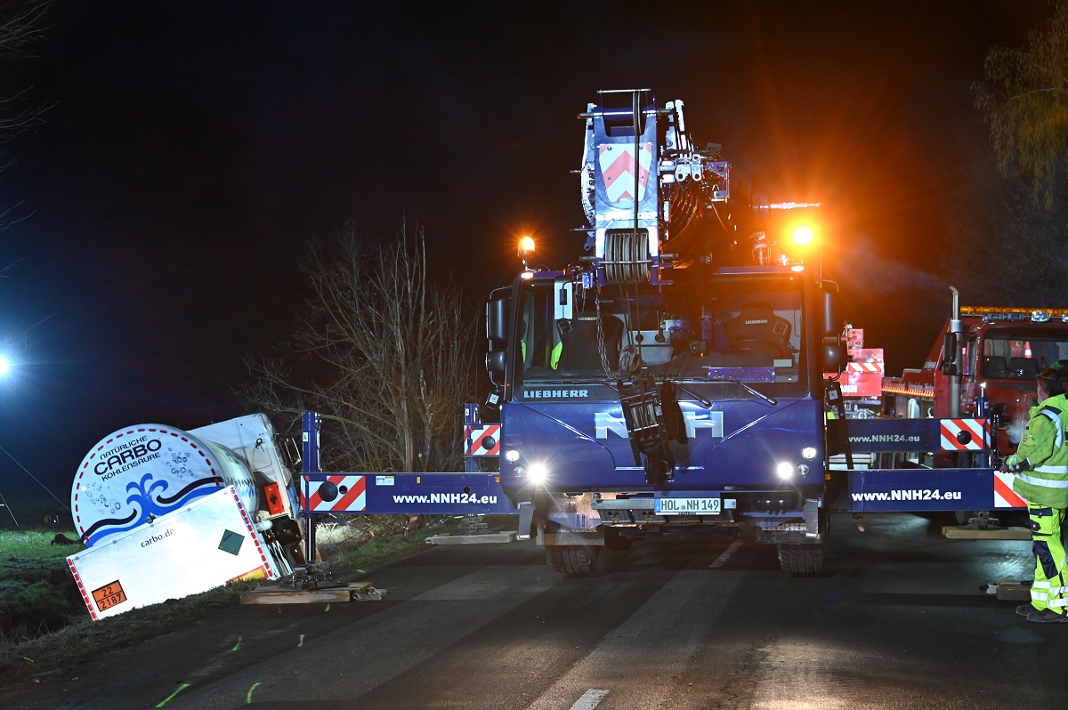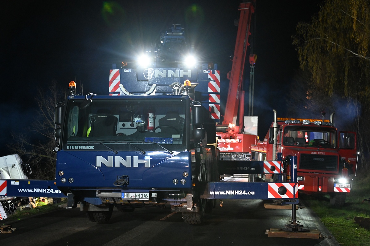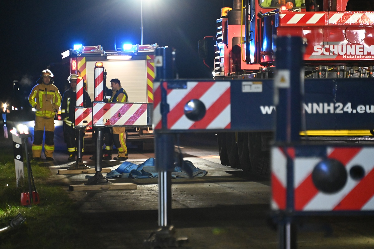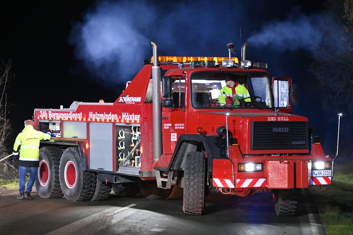 Zum Einsatz kamen unter anderem ein 50-Tonnen-Kran, ein 60-Tonnen-Kran sowie weitere Bergemaschinen aus den Kreisen Höxter und Holzminden. Aufgrund der schwierigen Lage des Lastwagens im Graben zogen sich die Arbeiten über mehrere Stunden hin. Erst gegen 2.30 Uhr gelang es, den Tanklastzug wieder auf die Fahrbahn zu heben und für den Abtransport vorzubereiten.