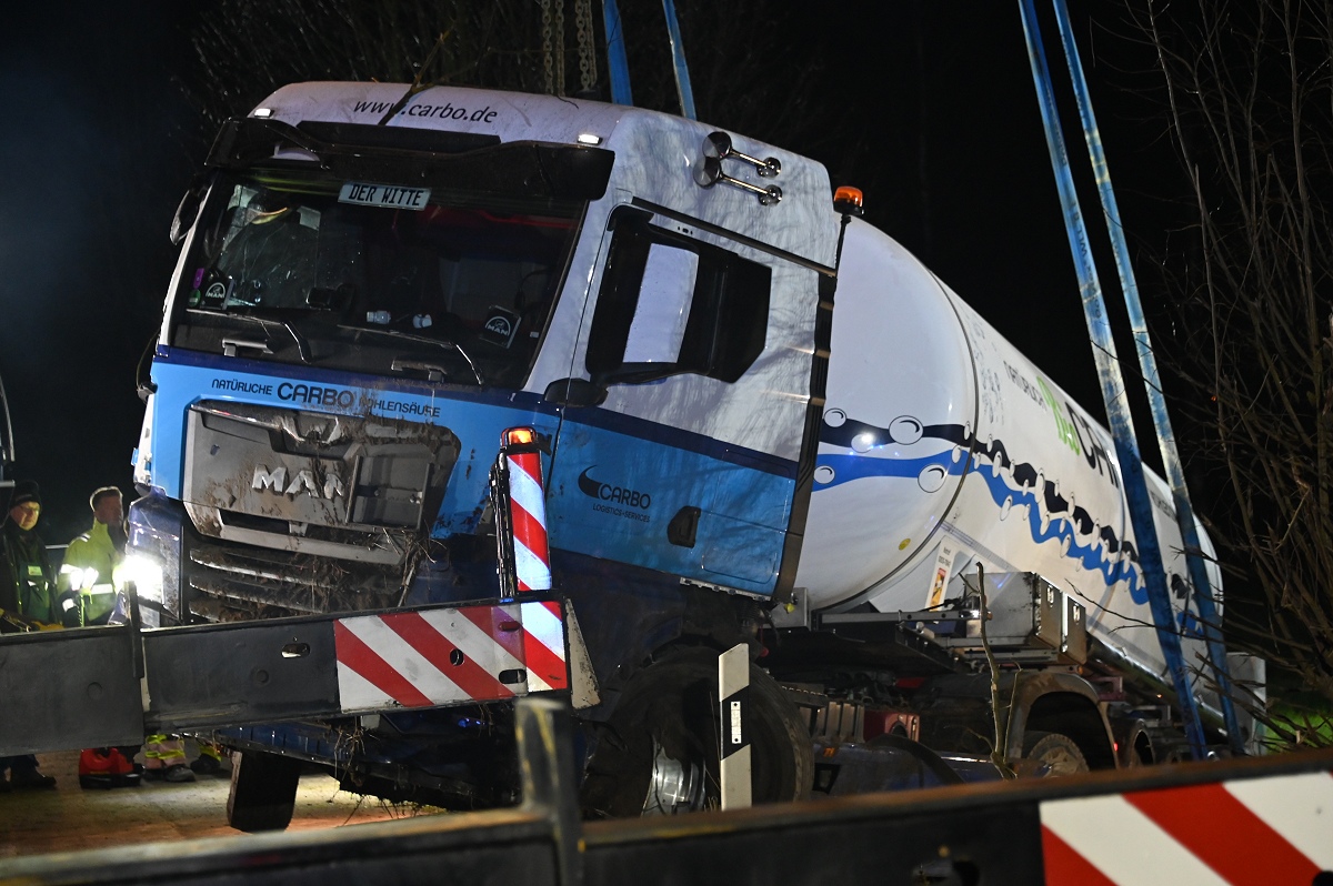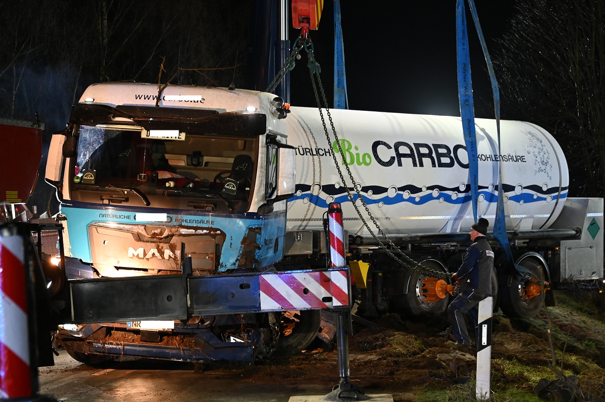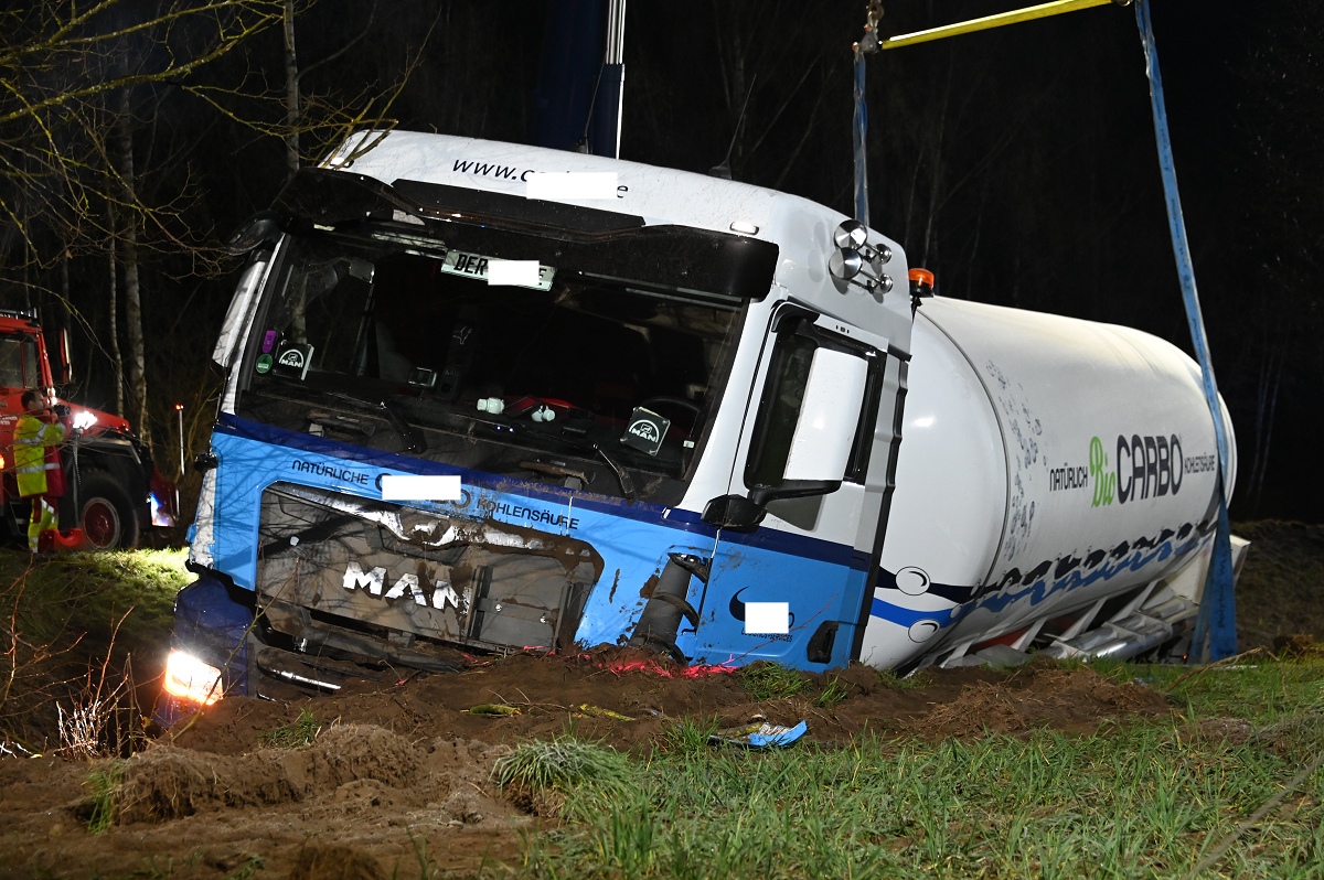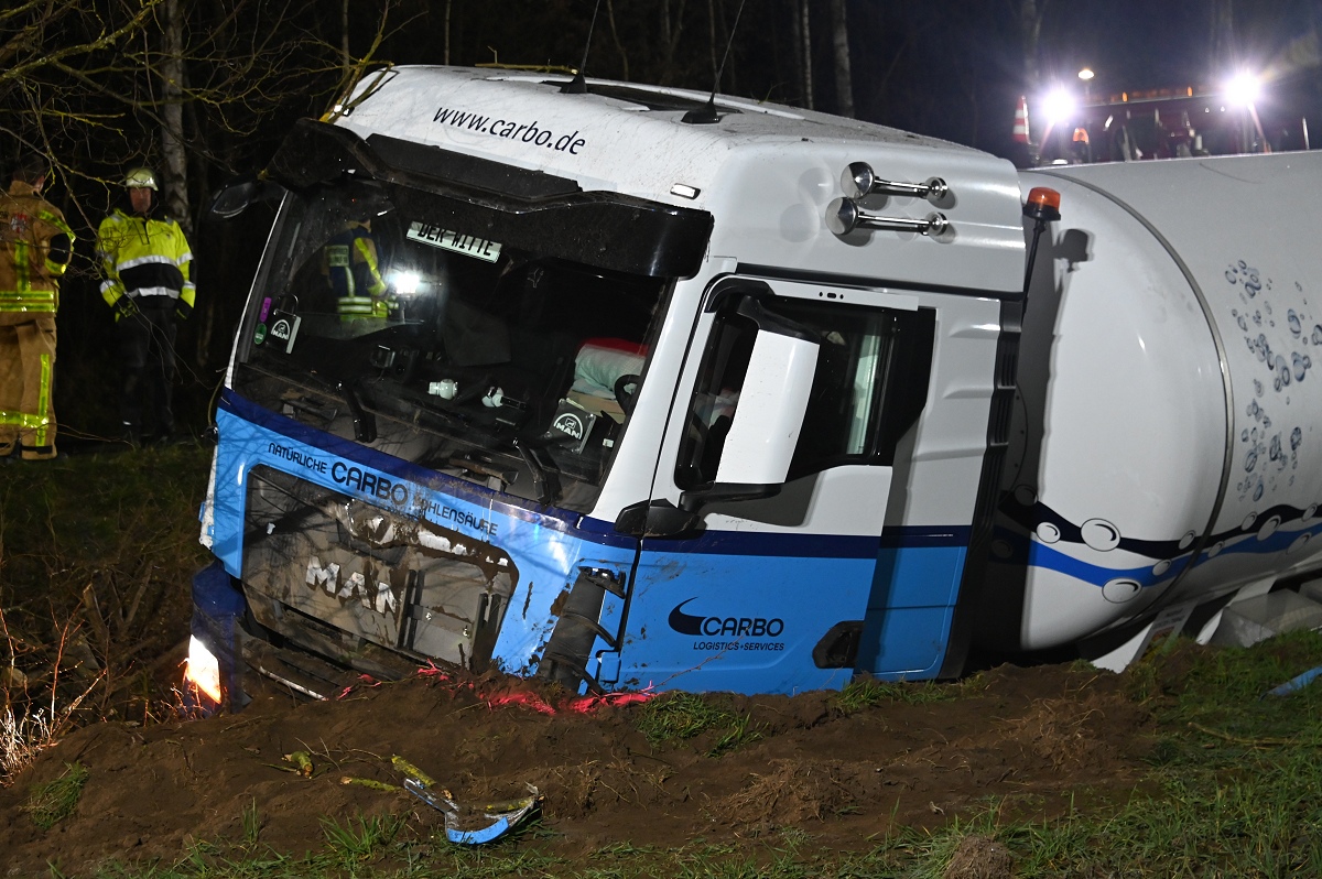 Durch die Wucht des Aufpralls geriet der Pkw in den Straßengraben. Auch der Tanklastzug kam von der Fahrbahn ab und bohrte sich tief in den Graben sowie in den Erdwall eines angrenzenden Ackers. Die Feuerwehr sicherte die Unfallstelle und überprüfte den Tanklastzug auf mögliche Beschädigungen.