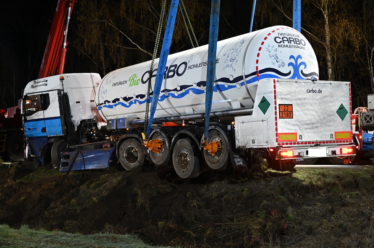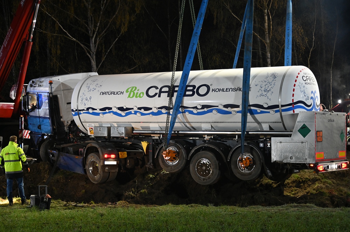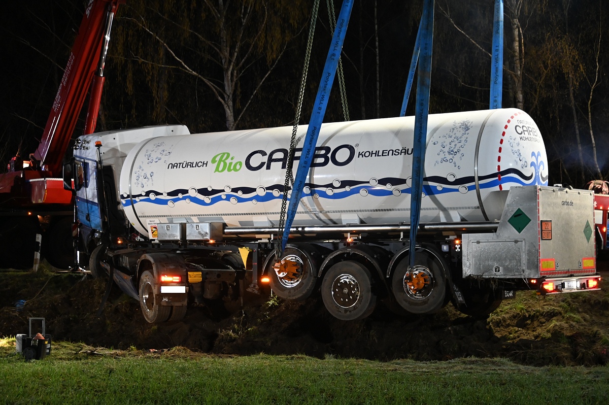Die Bergung des Tanklastzugs gestaltete sich schwierig und zeitaufwendig. Gegen 21.30 Uhr begannen die Arbeiten, nachdem zunächst ein Baum gekürzt werden musste, um Platz für die schweren Geräte zu schaffen. Die Einsatzstelle wurde großflächig ausgeleuchtet.