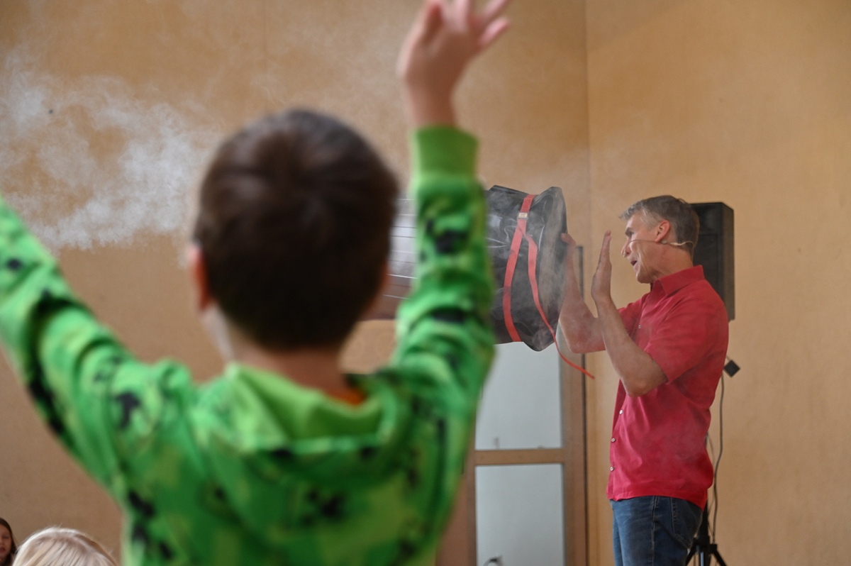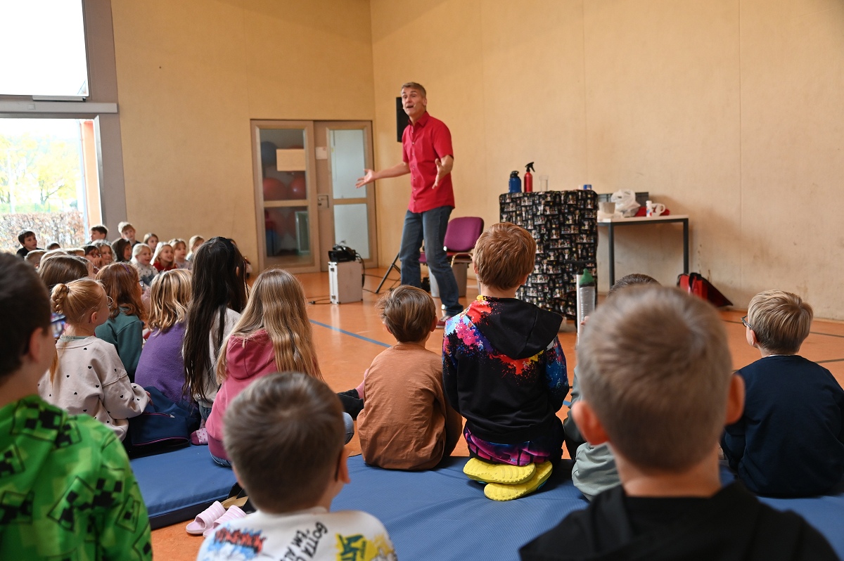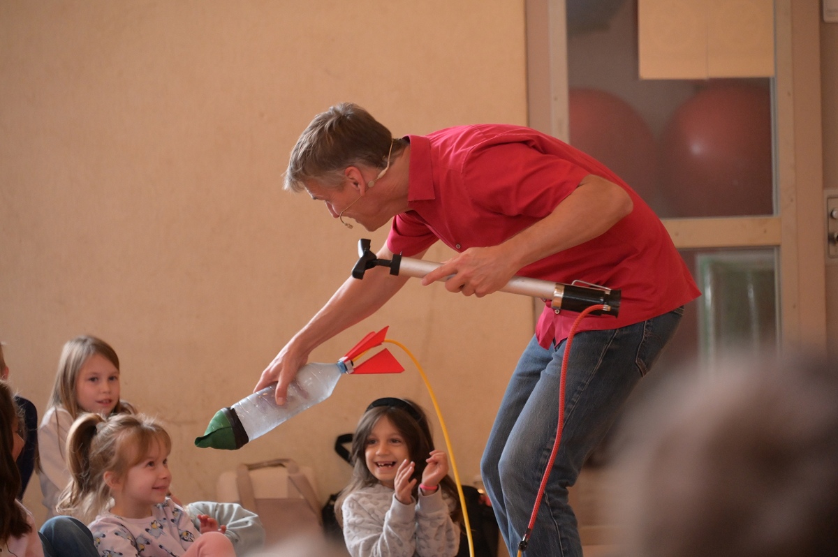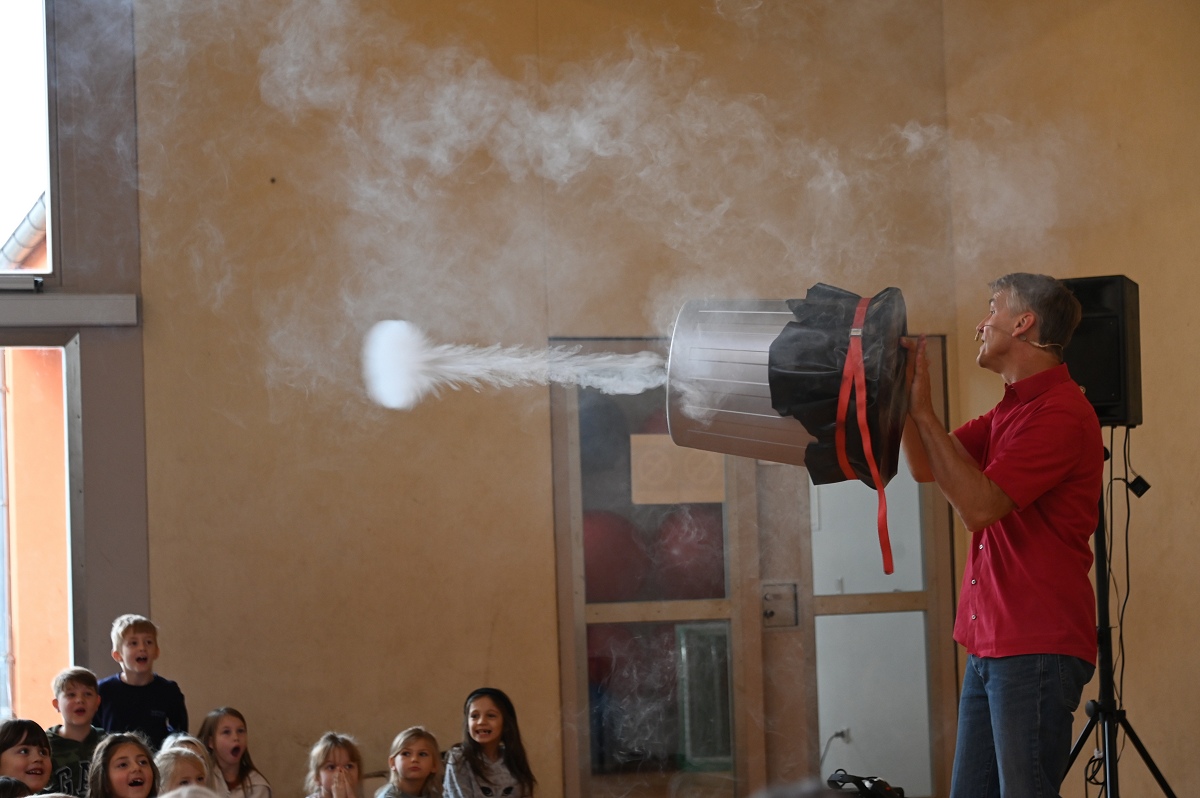 Doch nicht nur beeindruckende Experimente standen im Fokus: Die Kinder erfuhren spielerisch, wie Raketen fliegen, warum ein Feuer brennt oder wie man im Alltag Energie sparen kann. Besonders wichtig dabei – alle durften mitdenken, miträtseln und mitexperimentieren. Genau dieses aktive Erleben macht die Wissensshows der Physikanten zu nachhaltigen Lernerlebnissen.