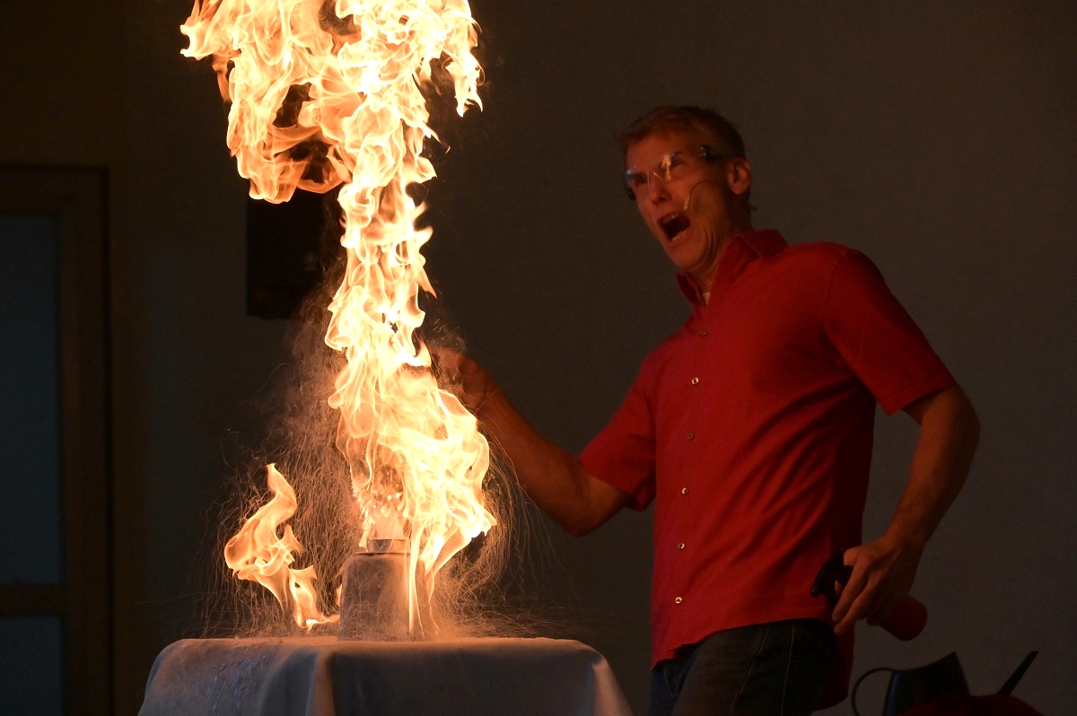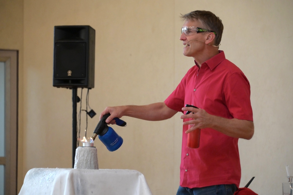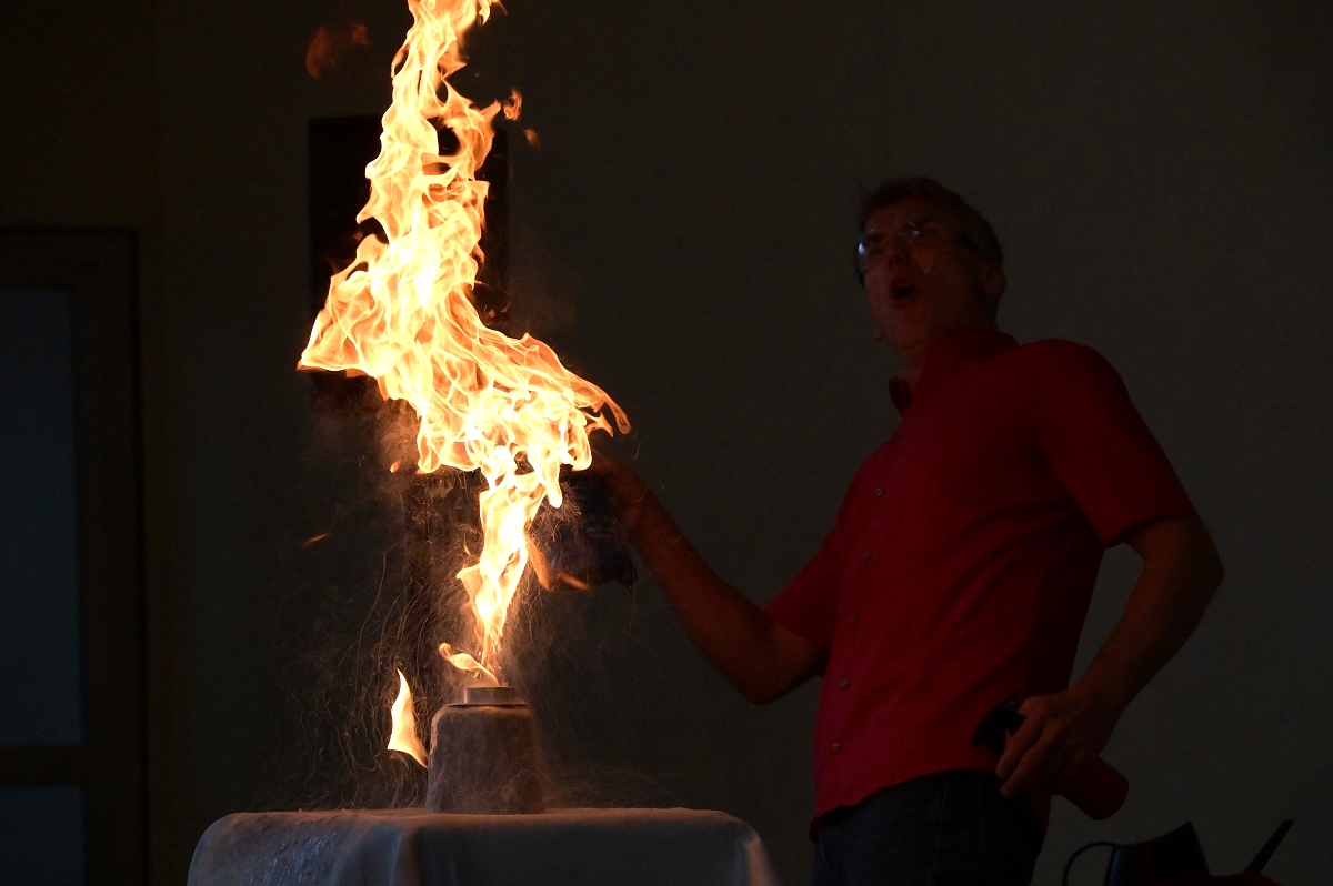 Im Mittelpunkt der Show standen die vier Elemente Feuer, Wasser, Luft und Erde. Wissenschaftsjournalist Dr. Sascha Ott, bekannt aus dem WDR-Format „Küchenexperimente“, präsentierte die physikalischen Phänomene kindgerecht, humorvoll und stets auf dem soliden Fundament wissenschaftlicher Fakten. So wurde ein kleines Teelicht plötzlich zu einem spektakulären Feuerball, und fünf Liter Wasser verwandelten sich in eine Schwalldusche, die für Staunen und Gelächter sorgte.