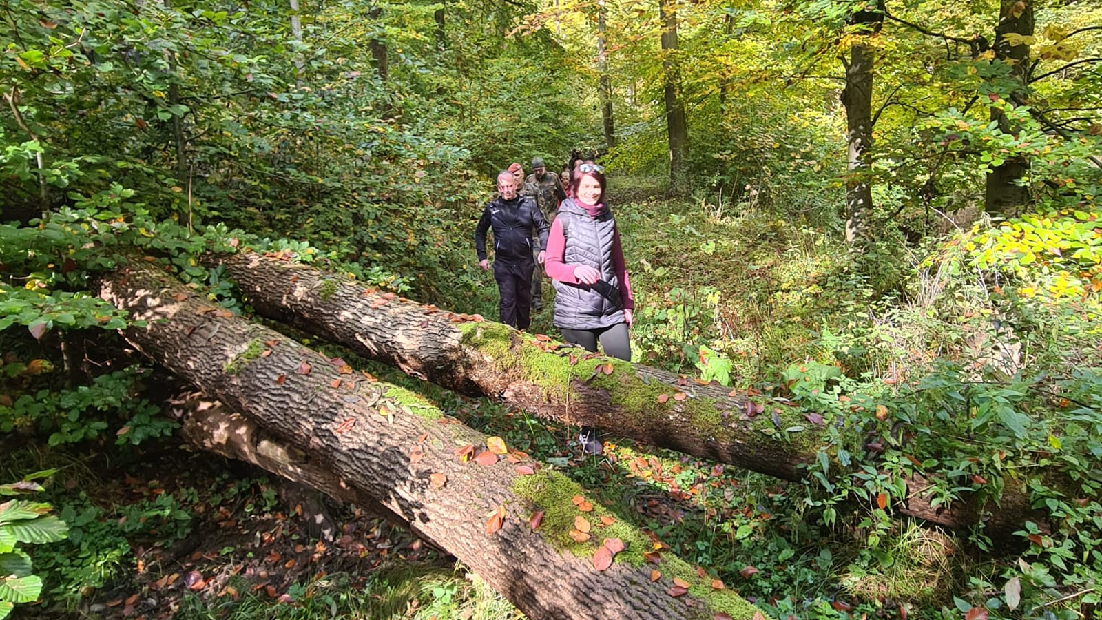 Anschließend begann der forderndste Abschnitt des Marsches. Die Strecke führte über Schotterwege, zeitweise durch dichtes Unterholz und über unbefestigte Pfade mit natürlichen Hindernissen. Besonders der Anstieg zum Aussichtspunkt auf dem Kiekenstein verlangte Kondition und Durchhaltevermögen, wurde aber mit einem weiten Blick über das Wesertal belohnt.