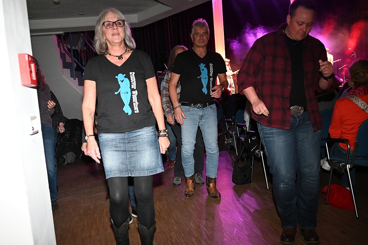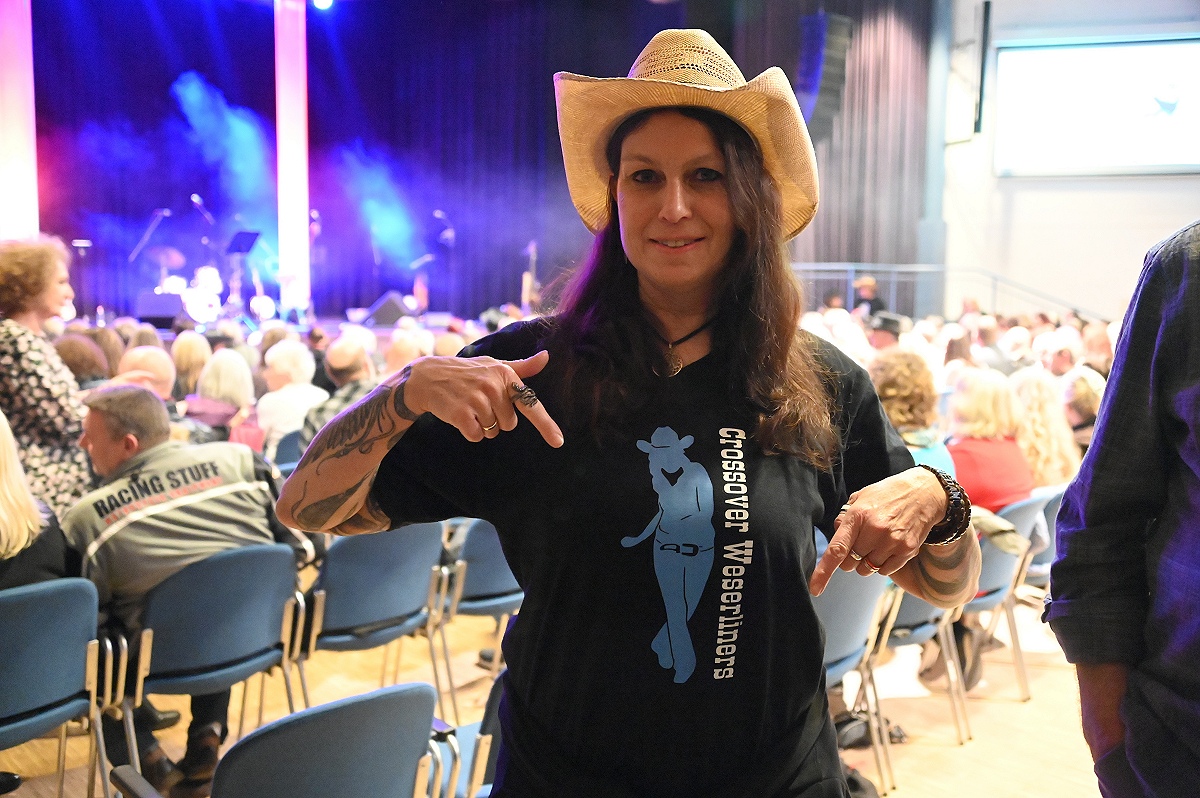 Die Linedancer erwiesen sich als wahrer Stimmungsmotor in der Halle. Unter ihnen war auch die Höxteranerin Tamara Weber, Mitglied der Line-Dance-Gruppe „Crossover Weserliners“ des MTV Holzminden e.V. Sie ließ sich von der Musik mitreißen und tanzte am Rand der Bühne eine spontane Choreografie zu den bekannten Songs. Aktuell tanzen die „Crossover Weserliners“ in Holzminden regelmäßig mit etwa 10 bis 14 Personen. Der Name sei entstanden, weil die Gruppe ursprünglich in Höxter – in der ehemaligen Fahrschule Weber – begann und später „über die Weser wechselte“ zum MTV Holzminden, erklärte Weber. „An diesem Abend hätten wir zu allen Liedern tanzen können“, sagte sie. Der Bühnenrand wurde so kurzerhand zur zweiten Bühne, von der aus sich die Dynamik wie eine Welle durch die gesamte Stadthalle ausbreitete.