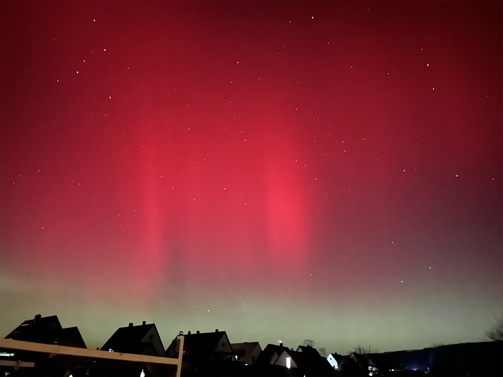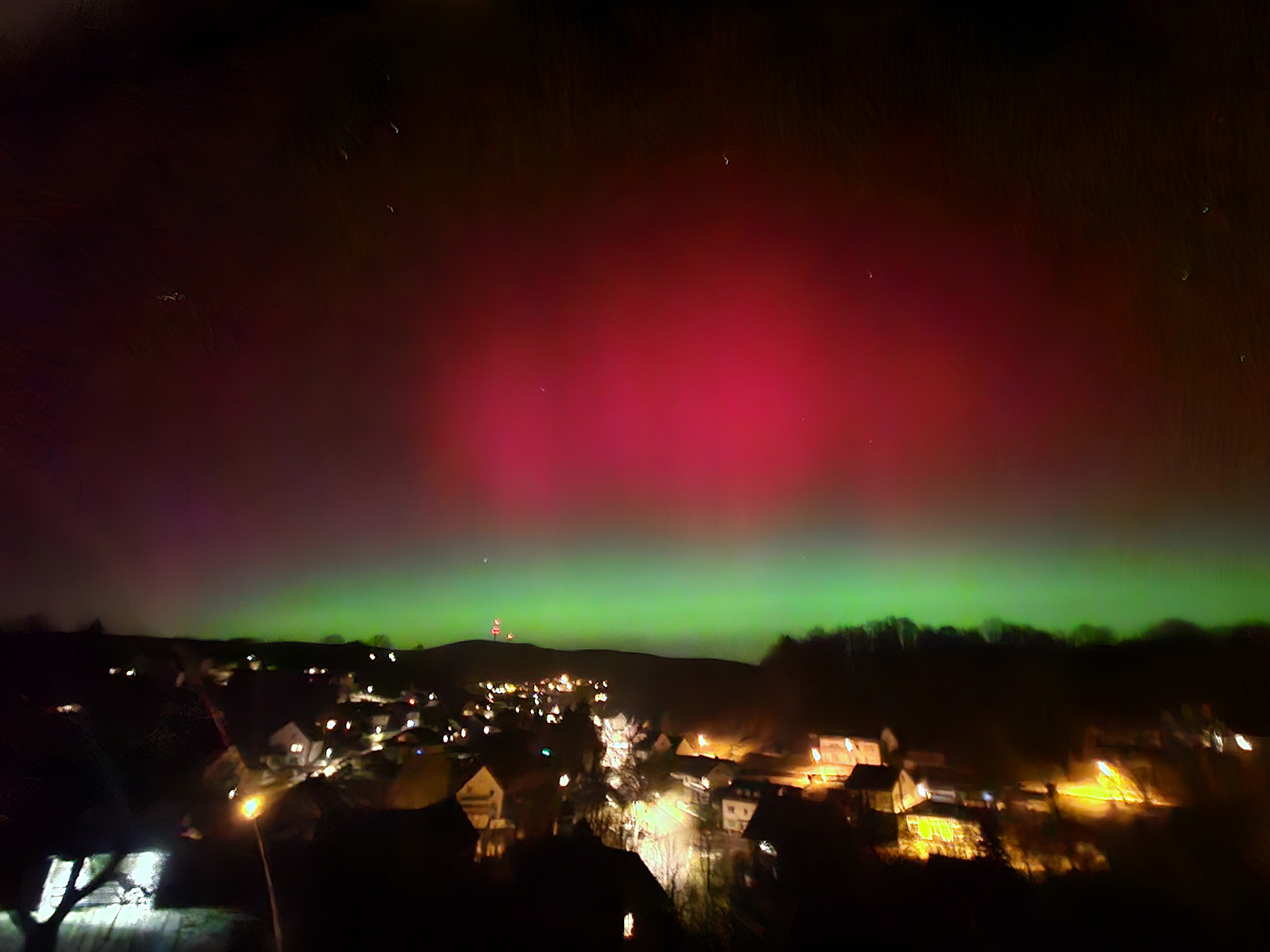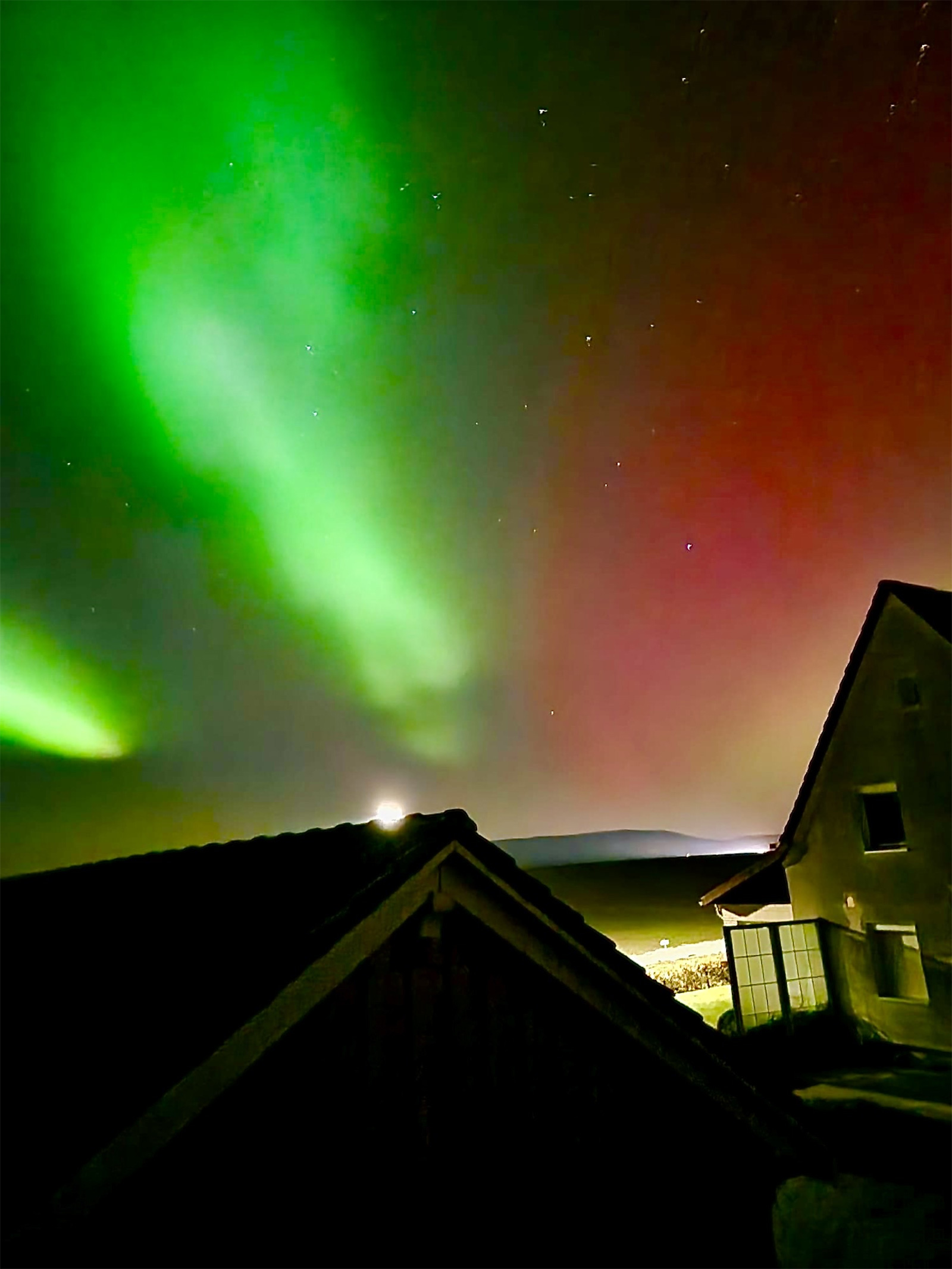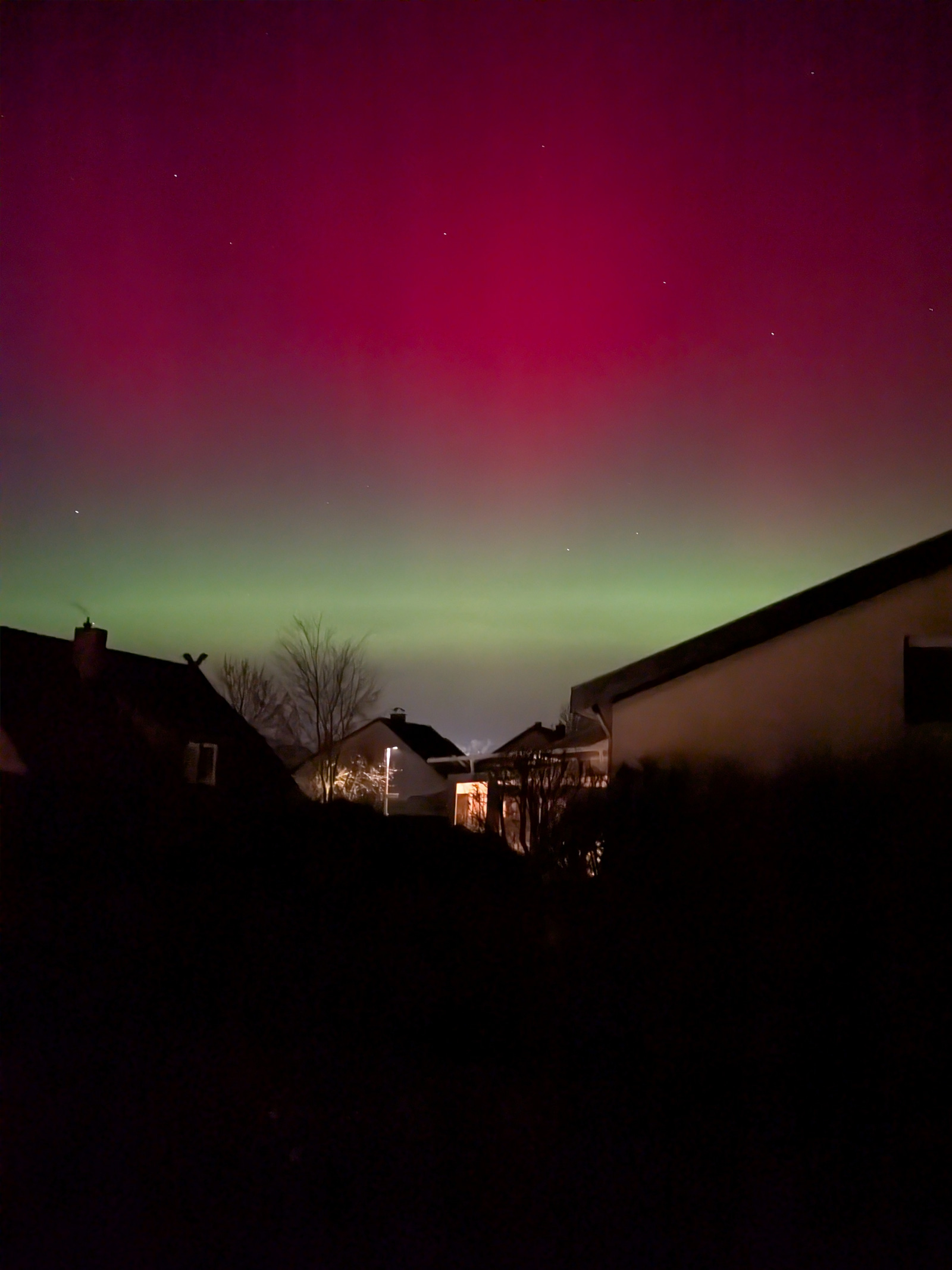 Normalerweise erscheinen Polarlichter in Mitteleuropa, wenn überhaupt, eher als blasses, weißliches Leuchten. Dass in dieser Nacht auch rötliche und grünliche Farbtöne deutlich erkennbar waren, gilt als klares Zeichen für eine besonders hohe Intensität. Sichtbare Farben mit bloßem Auge treten nur bei sehr starken geomagnetischen Ereignissen auf.