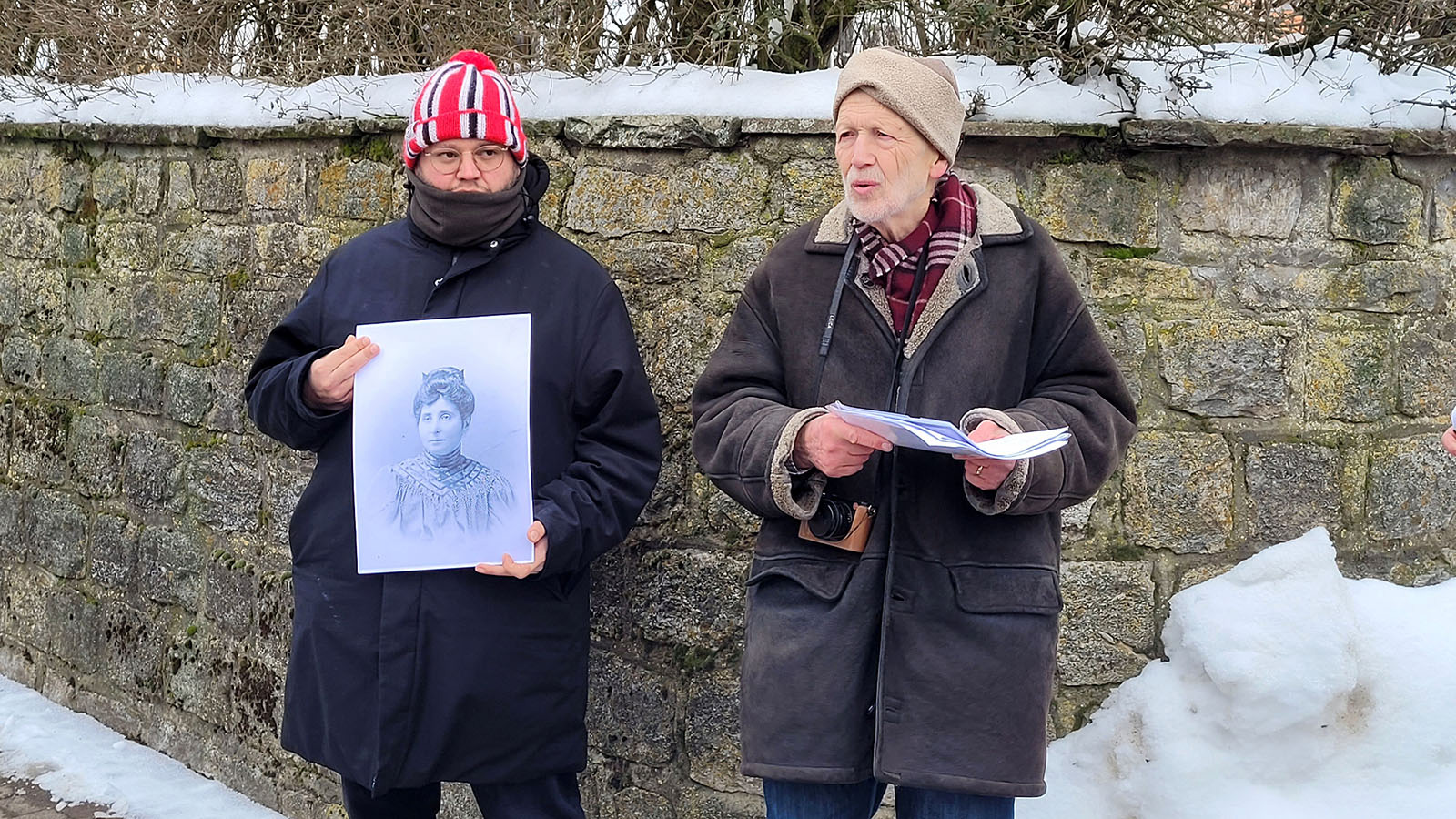 Die Verlegung begann um 14.30 Uhr in der „Kirchstraße“ und führte anschließend zu vier weiteren Stationen im Ort. Rund 40 Interessierte begleiteten den Rundgang. Unter ihnen befanden sich auch jüdische Nachfahren der Opfer, die eigens aus England angereist waren. An jeder Station berichtete Dr. Gelderblom aus dem Leben der dort einst wohnhaften Menschen und schilderte deren Verfolgungsschicksale. Rabbi Dr. Walter Rothschild ergänzte die Ausführungen mit zusätzlichen historischen Einordnungen und übersetzte sie für die englischsprachigen Gäste. Gebete und Gesang verliehen dem Gedenken einen würdigen Rahmen.