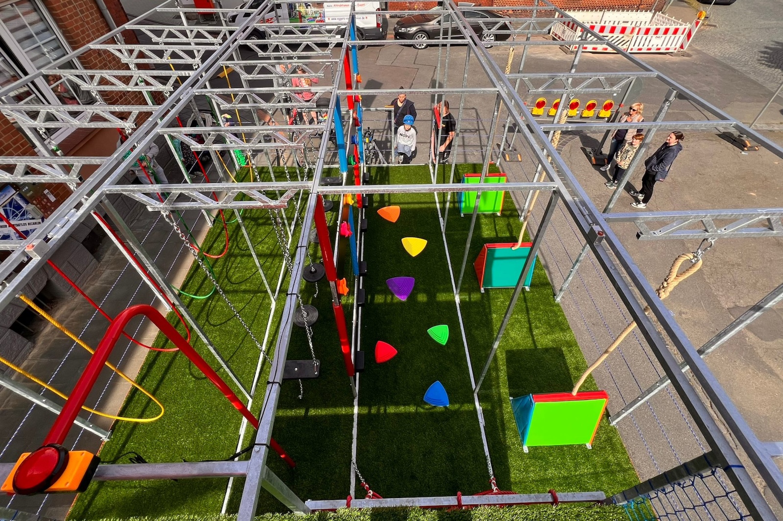 Auch Bürgermeister Christian Belke fordert die Stadtgemeinschaft heraus. Er wettet, dass bis 15 Uhr keine 50 Kinder den mobilen Ninja-Parcours auf dem Vorplatz der Lutherkirche absolvieren. Für jedes Kind, das die Strecke meistert, spendet er 6 Euro – maximal 300 Euro – für das geplante Spielplatzprojekt „Holzminden goes Ninja“.