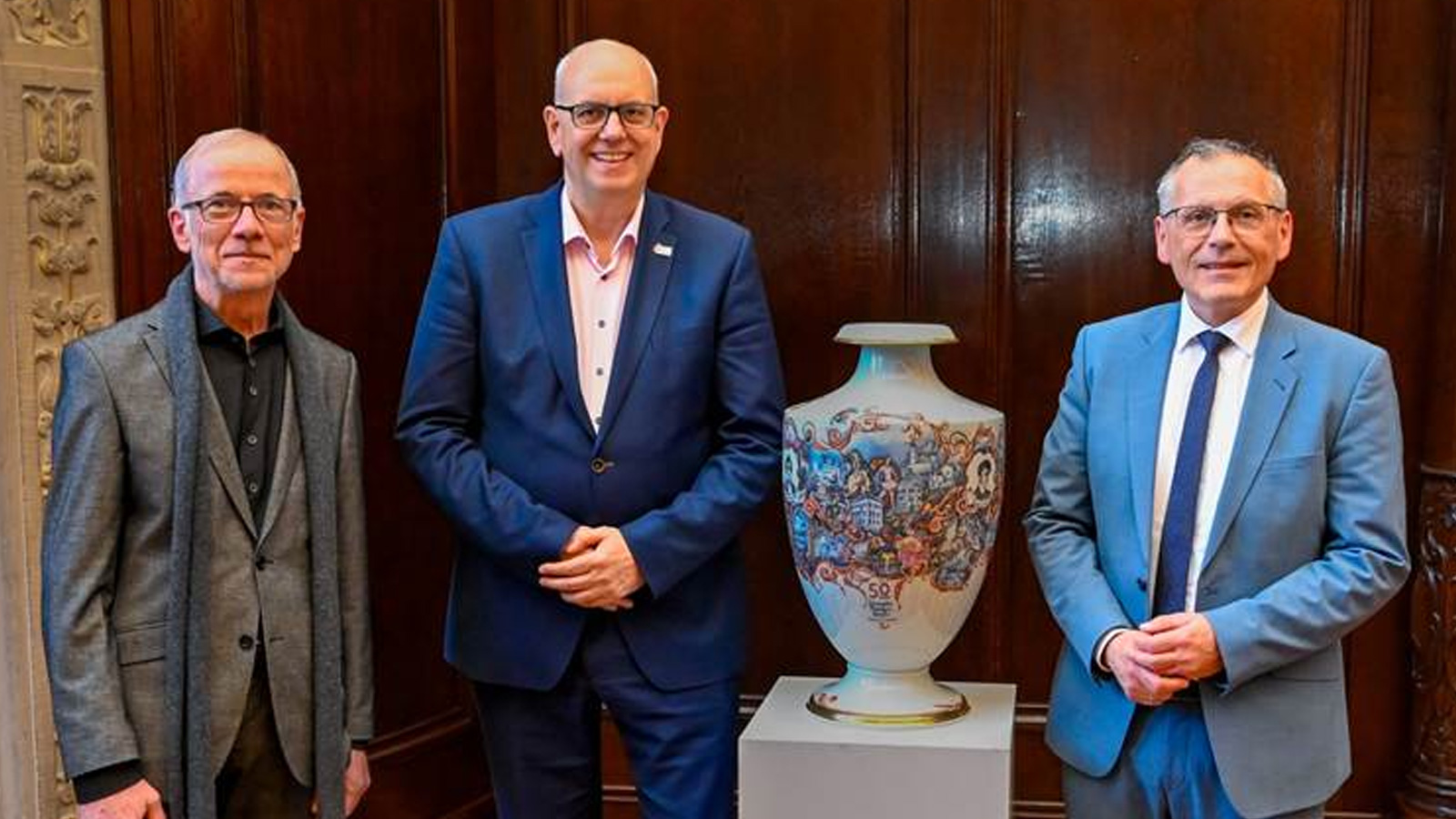Benjamin Schäfer (Geschäftsführer Deutsche Märchenstraße), Bürgermeister Andreas Bovenschulte und Andreas Siebert (Vorstand Deutsche Märchenstraße e. V., von links) mit dem Unikat der Märchenstraßen-Vase der Porzellanmanufaktur Fürstenberg zu Beginn der Feier. Foto: Senatspressestelle der Hansestadt Bremen.