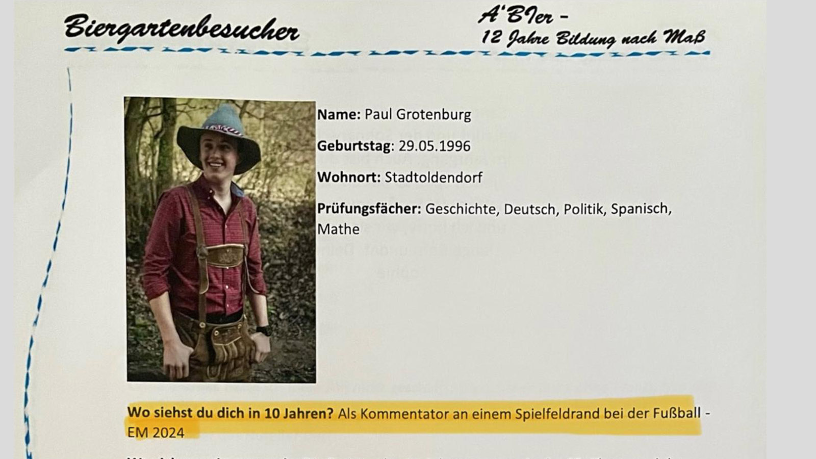 Ein besonderer Moment bleibt das Eröffnungsspiel der Europameisterschaft 2024. Ein Ziel, das er sich schon als Schüler gesetzt hatte. 2014 schrieb er auf die Frage, wo er sich in zehn Jahre sehe, ins Abi-Heft: Als Reporter bei der EM 2024. Als er schließlich im Stadion sitzt, wird ihm die Tragweite bewusst. „Da habe ich das erste Mal gemerkt, dass alles in den vergangenen zehn Jahren einen Sinn hatte. Es hat sich angefühlt, als hätte sich ein Kreis geschlossen.“ Ein Moment, der für ihn bis heute nachwirkt.
