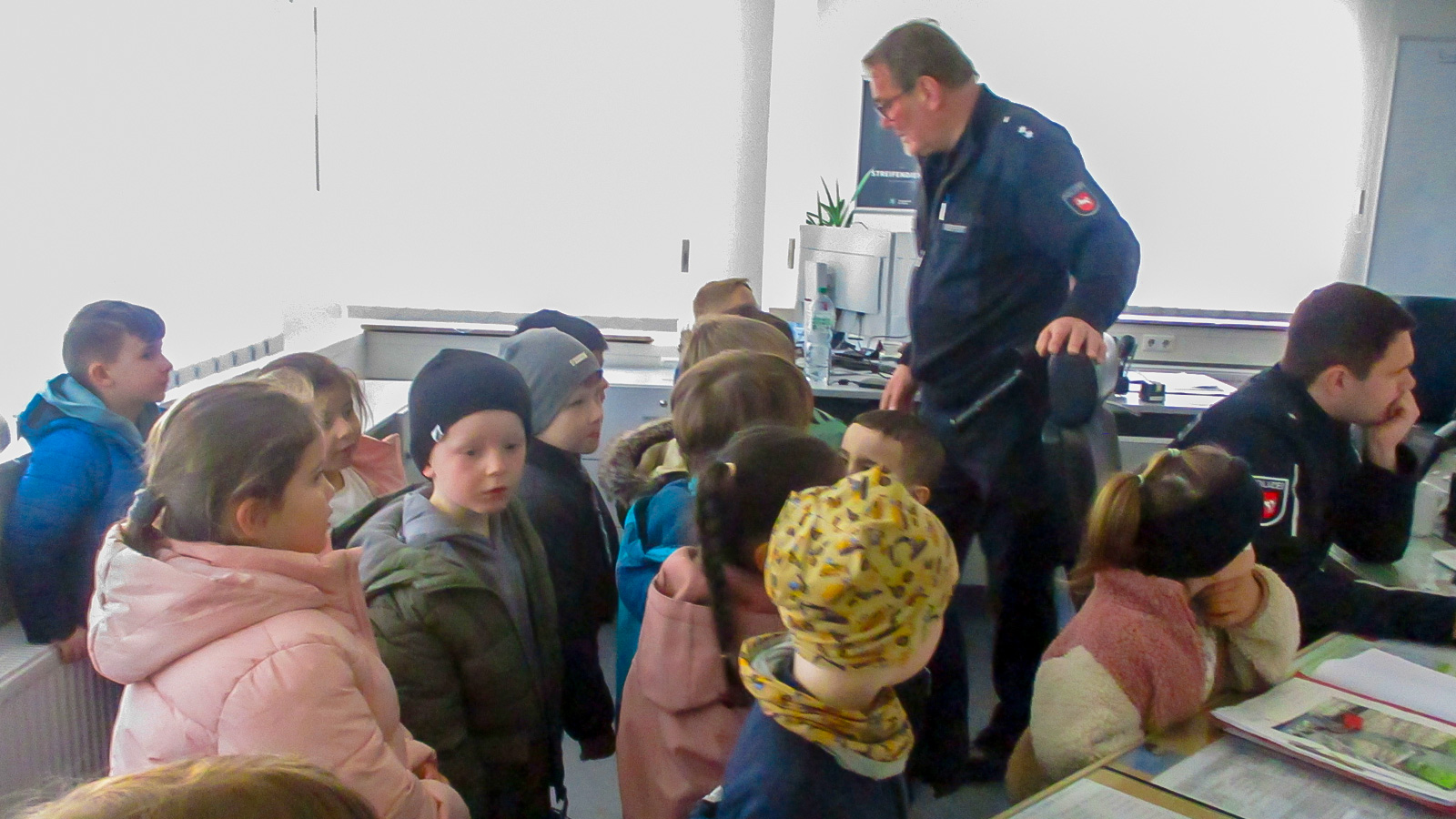 Auch die Funkzentrale wurde vorgestellt. Dort wurde erklärt, wie Notrufe eingehen und Einsätze koordiniert werden. Besonders aufmerksam verfolgten die Kinder die Einblicke in den gesicherten Bereich mit den Schließfächern für Dienstwaffen.