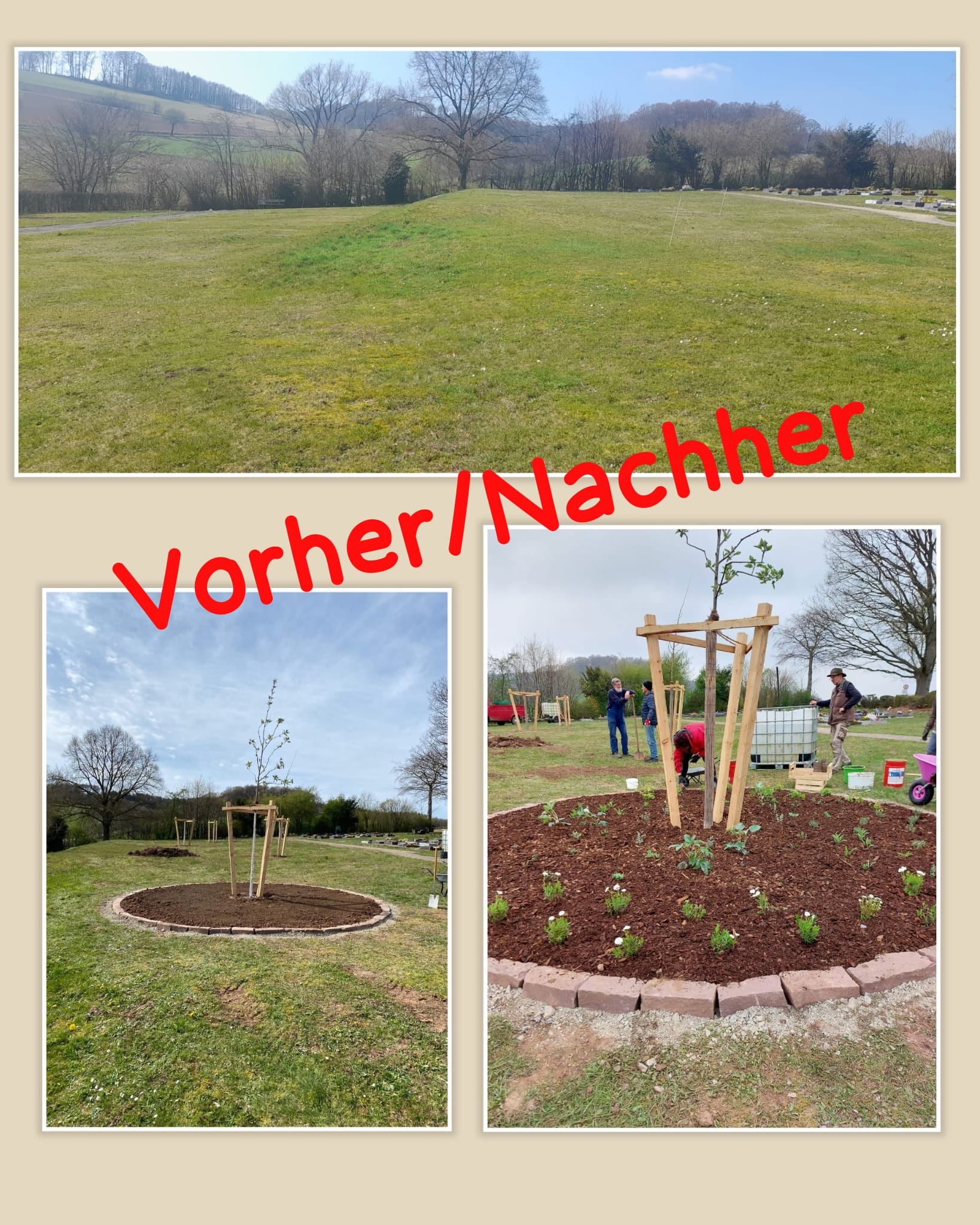 Vier Bäume heimischer Arten, finanziert durch Spenden, konnten gepflanzt werden. Zudem wurde als erster Schritt ein Urnenrondell angelegt und bepflanzt. Dieses bietet künftig die Möglichkeit der Bestattung sowohl in Einzel- als auch in Doppelgräbern.