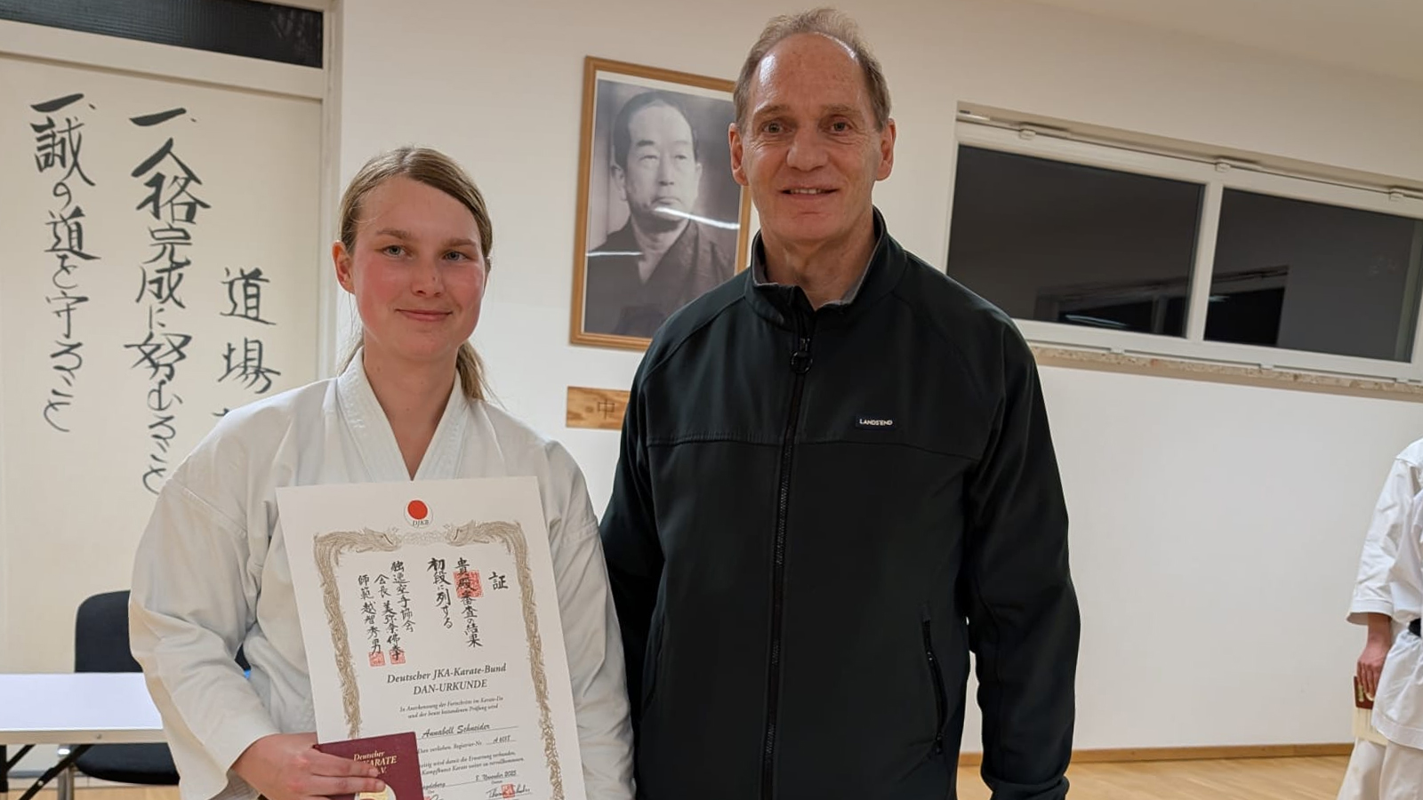 Mit Bravour meisterte sie alle Anforderungen und durfte voller Stolz die Urkunde aus den Händen des DJKB-Bundestrainers entgegennehmen. Es war ein emotionaler Moment, der den Übergang von der Schülerin zur ernsthaft Praktizierenden markiert. Denn der 1. Dan ist nicht das Ende der Ausbildung, sondern der Beginn des Meisterweges im Karate.