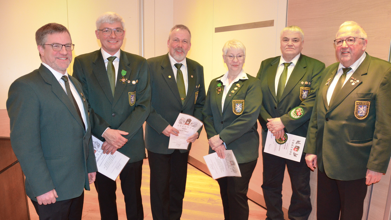 Die Verdienstnadel in Silber des Niedersächsischen Sportschützenverbandes erhielten Jugendleiter Karl Hahn vom SV Bodenwerder, der stellvertretende Sportleiter Andre Nolte vom SV Eimen, der stellvertretende Jugendleiter Daniel Wuttke von der BSGi Stadtoldendorf, der Vorsitzende Malte Gründel vom SV Coppengrave sowie der Vorsitzende und Schatzmeister des KSV Holzminden Markus Schütte vom SV Daspe-Hehlen.